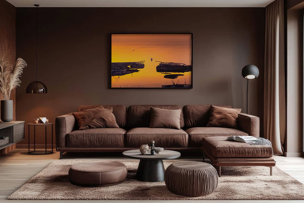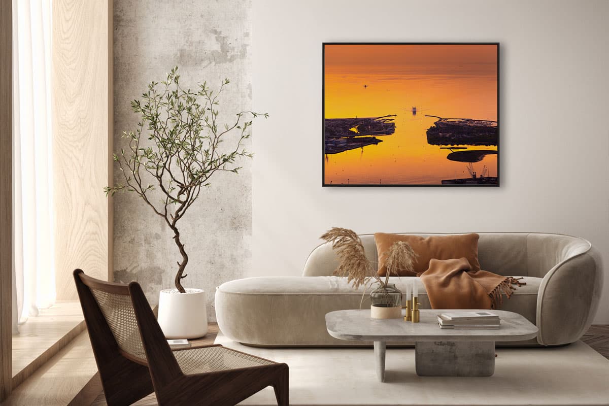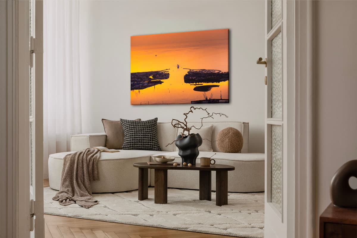 Erlebe Warnemünde aus einer Perspektive, die sonst nur den Möwen vorbehalten ist. Das Wandbild „Baltic Gate“ ist eine atemberaubende Luftaufnahme, die den Moment einfängt, in dem der Seekanal, die Hohe Düne und der Breitling im intensiven Gold eines norddeutschen Sonnenuntergangs verschmelzen.