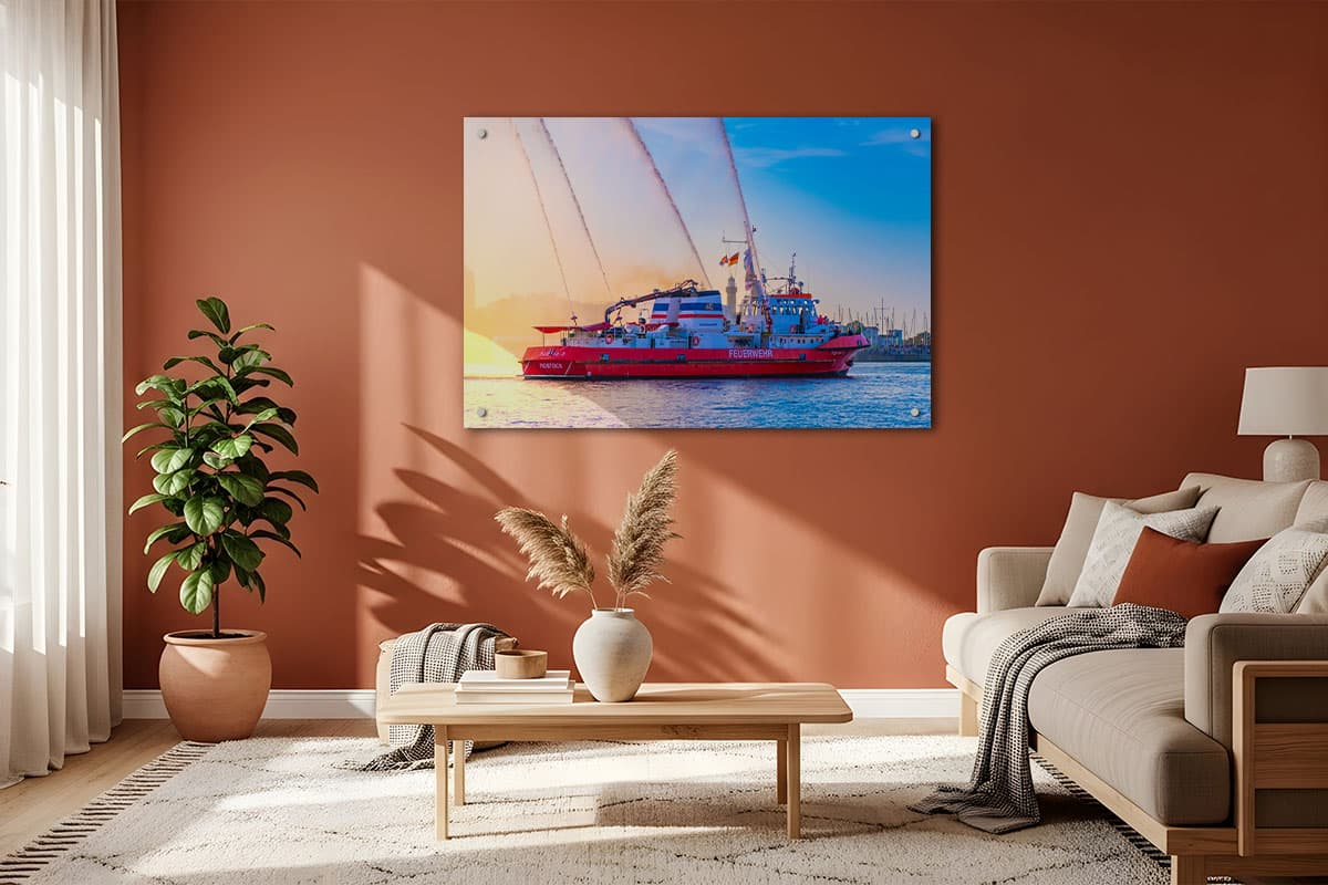 Erlebe maritime Geschichte in voller Aktion! Das Wandbild „Feuerlöschboot FLB-40-3“ fängt einen spektakulären Moment im Rostocker Hafen ein. Mit ausgefahrenen Wasserkanonen und vor der malerischen Kulisse von Warnemünde zeigt sich dieser treue Veteran der Ostsee von seiner eindrucksvollsten Seite. Das warme Licht der tiefstehenden Sonne verleiht der Szenerie eine beinahe heroische Atmosphäre.