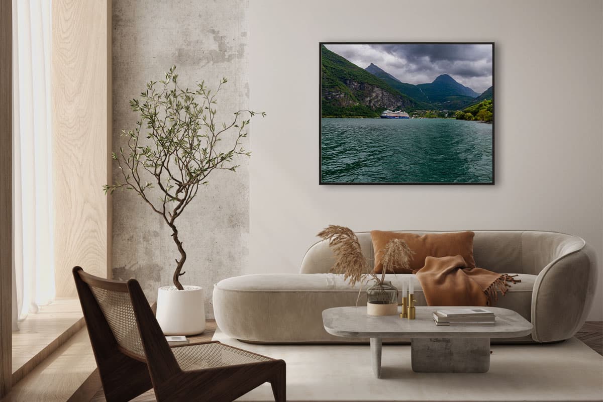 Dieses Motiv aus der Cruisespotter-Kollektion fängt die atemberaubende Dimension Norwegens ein. Das leuchtende Blau des Schiffes bildet einen faszinierenden Kontrast zu den erdigen Tönen der Berge und dem smaragdgrünen Wasser des Fjords. Ein Kunstwerk, das die Stille der nordischen Wildnis und die Sehnsucht nach Freiheit in jedem Raum spürbar macht.