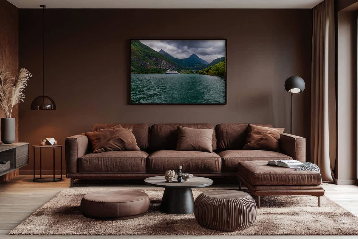 Erlebe die perfekte Symbiose aus modernster Ingenieurskunst und der ungezähmten Gewalt der Natur. Das Wandbild „Fjord-Giganten“ präsentiert die Mein Schiff 7 in einer der spektakulärsten Landschaften der Welt: dem Geirangerfjord. Während das tiefblaue Wasser sanft gegen den Rumpf schlägt, ragen im Hintergrund die massiven, grün bewachsenen Felswände empor, deren Gipfel sich in einer dramatischen Wolkendecke verlieren.