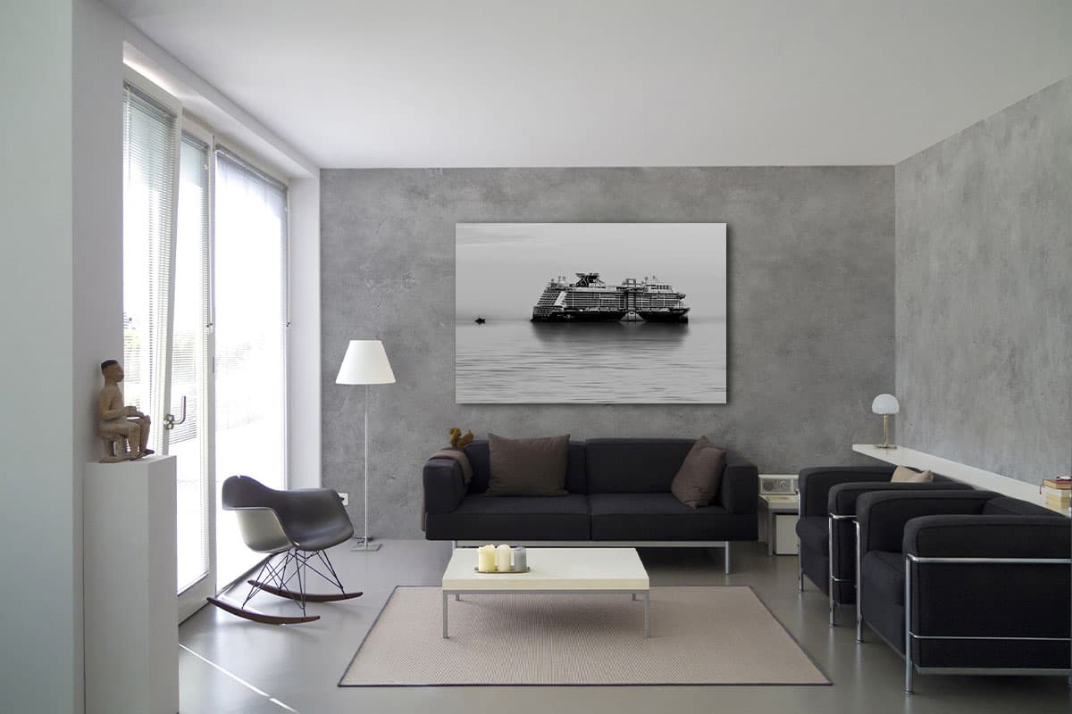 Ein besonderes Detail dieser Aufnahme ist das Lotsenboot Klaashahn, das als kleiner, aber mutiger Begleiter hinter dem Kreuzfahrtriesen zu sehen ist und den enormen Größenkontrast auf dem Wasser eindrucksvoll unterstreicht. Dieses monochrome Design passt perfekt in moderne, hell gestaltete Räume und verleiht jeder Wand eine edle, fast schwebende Atmosphäre.