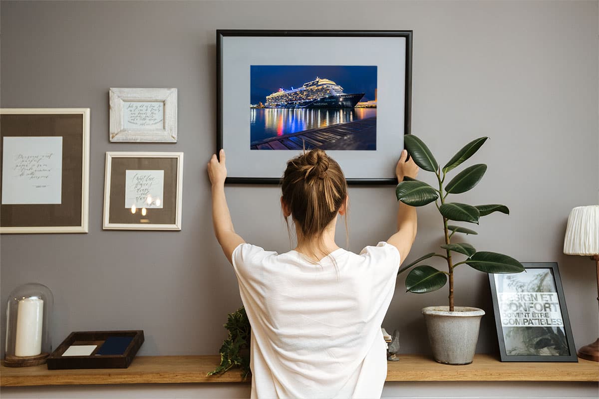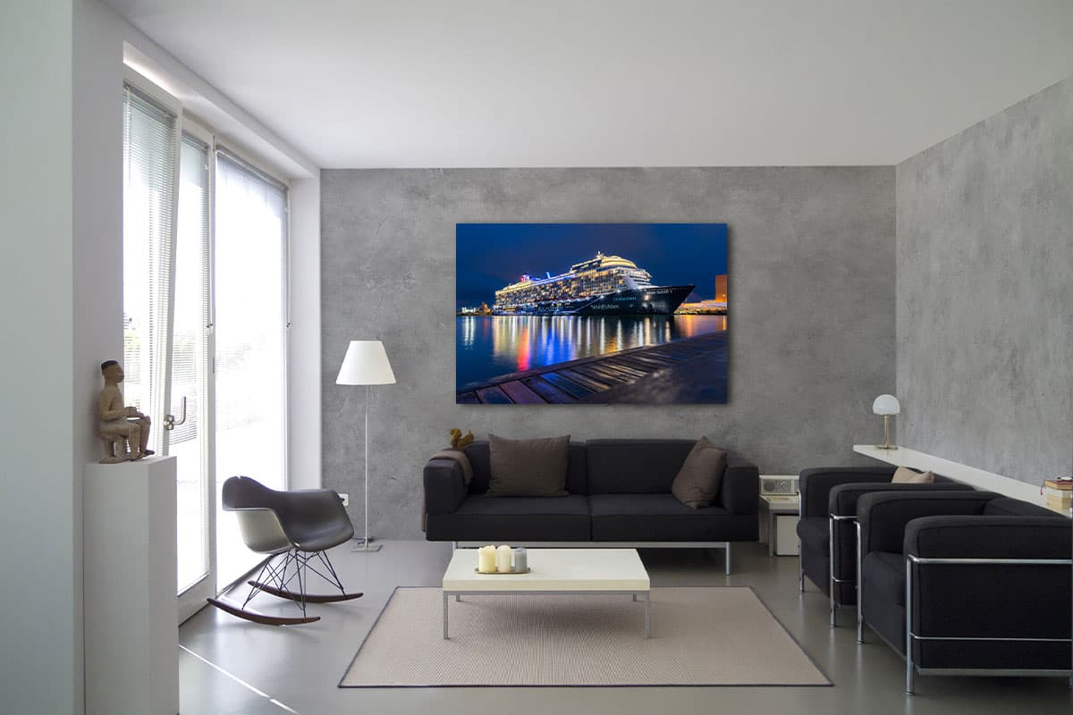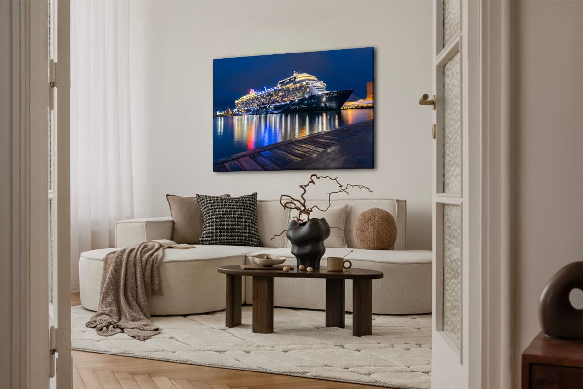 Die Aufnahme besticht durch ihre harmonische Komposition: Das strahlende Weiß der MS Vista kontrastiert sanft mit dem abendlichen Wolkenspiel, während die präzisen Lichtreflexionen im Vordergrund dem Bild eine beeindruckende Tiefe verleihen. Es ist ein Moment der Entschleunigung, der die Faszination einer Seereise direkt in Ihre Räumlichkeiten bringt.