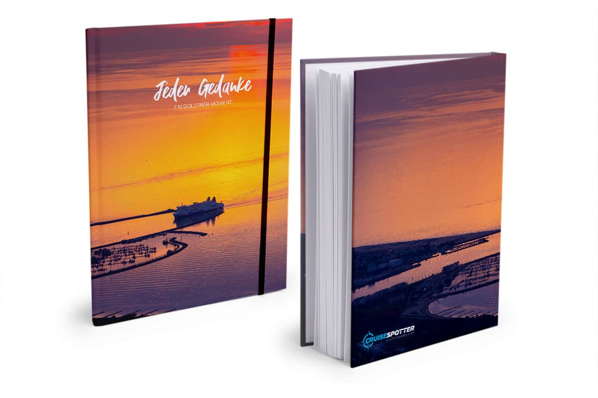 Das Notizbuch „Golden Gate Warnemünde“ ist eine Hommage an die magischen Momente an der Ostseeküste. Das Cover-Motiv zeigt das Fährschiff Skåne der Stena Line bei der stimmungsvollen Einfahrt in den Warnemünder Seekanal. Die untergehende Sonne steht dabei exakt im Zentrum zwischen den Molenfeuern und taucht die Szenerie in ein spektakuläres, goldenes Licht – ein echtes „Golden Gate“ des Nordens.