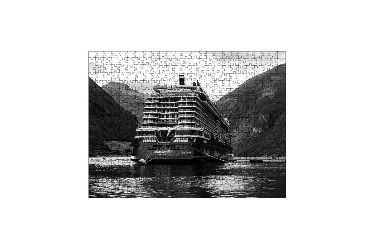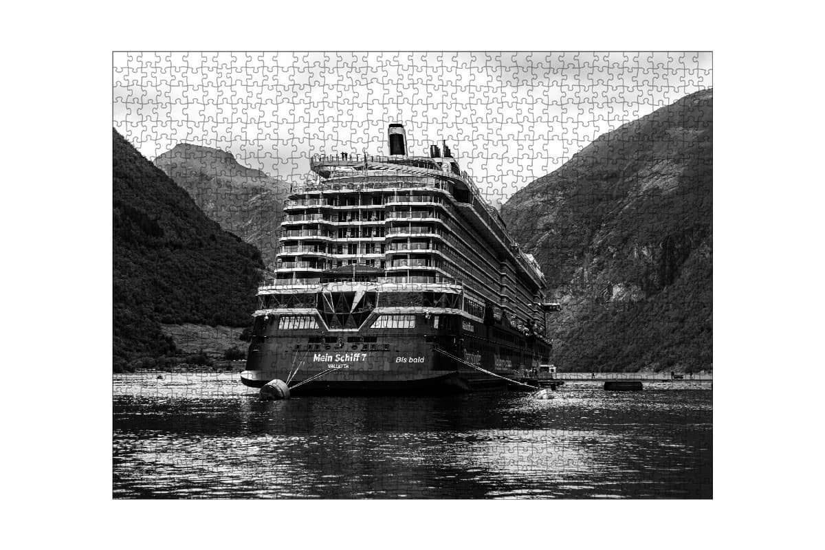 Erlebe einen der berühmtesten Orte der Welt in einer völlig neuen Ästhetik. Das Premium-Puzzle „Ankerplatz Geiranger“ zeigt die imposante Mein Schiff 7 im weltbekannten Geirangerfjord. Durch die bewusste Wahl einer Schwarz-Weiß-Aufnahme treten die gewaltigen Dimensionen der norwegischen Felswände und die moderne Architektur des Schiffes besonders eindrucksvoll hervor.