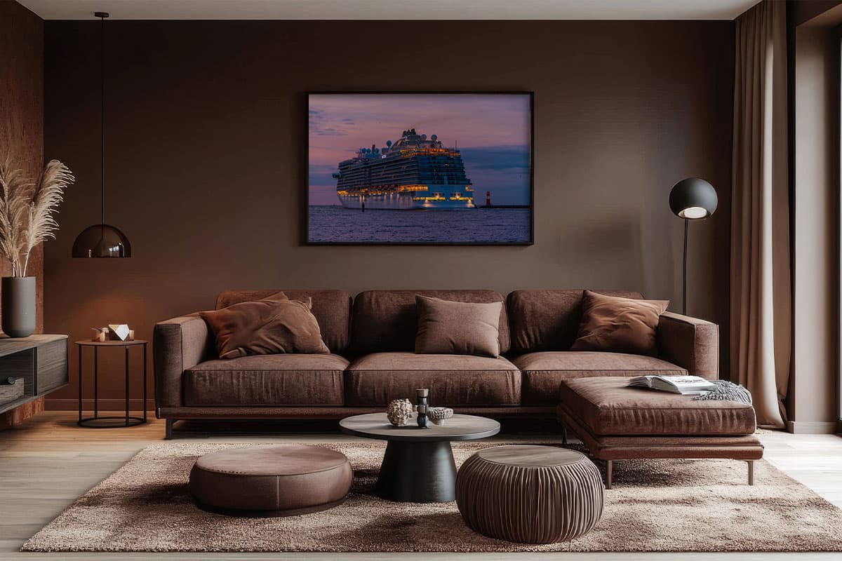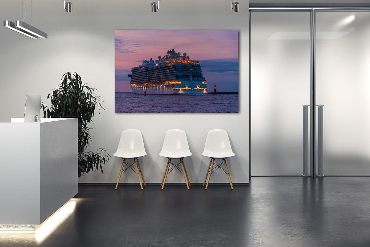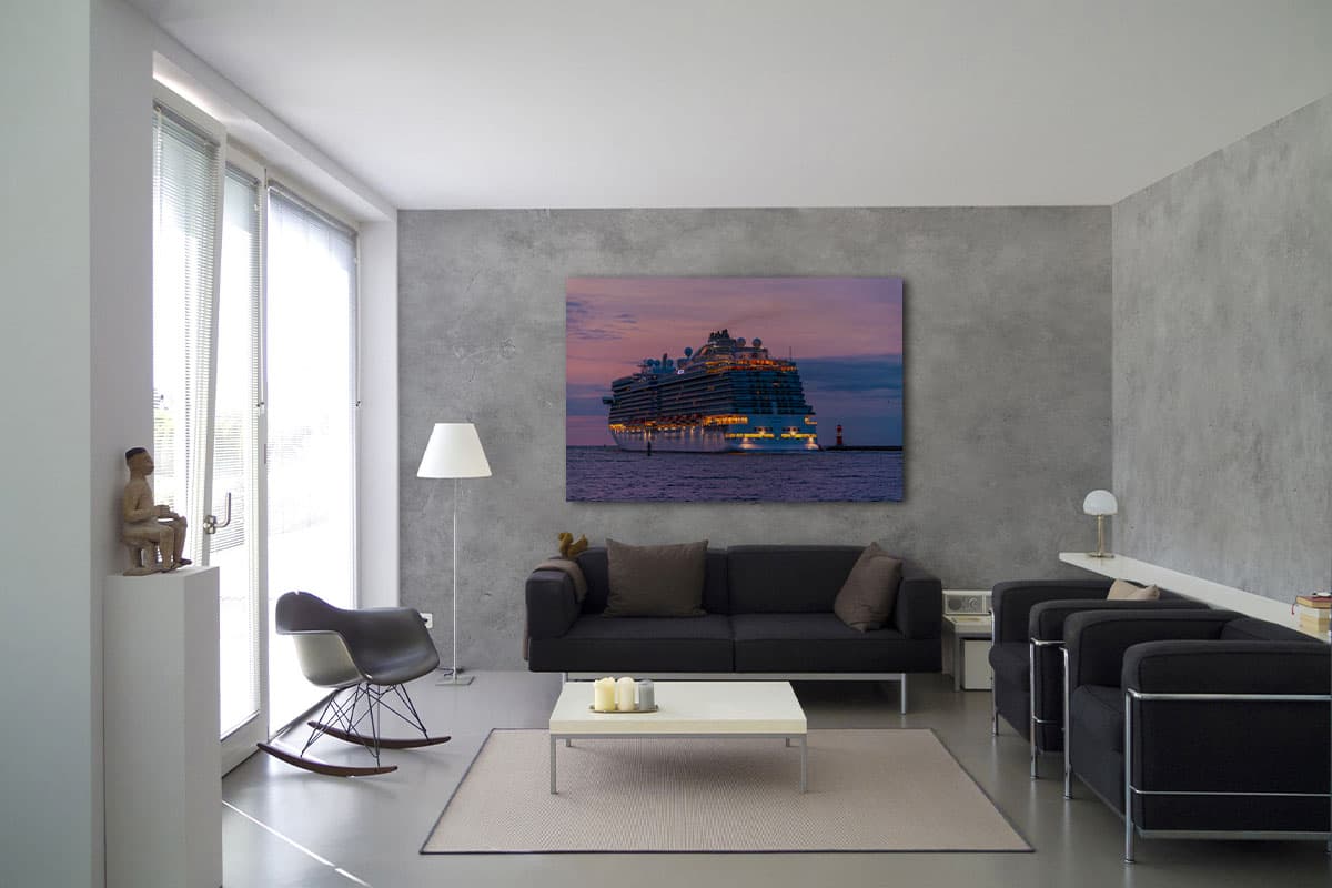 Enorme Detailtiefe: Von den beleuchteten Rettungsbooten bis hin zu den Passagieren an der Reling bietet das Bild unzählige Details, die auf hochwertigen Drucken wie Acrylglas oder Alu-Dibond brillant zur Geltung kommen.