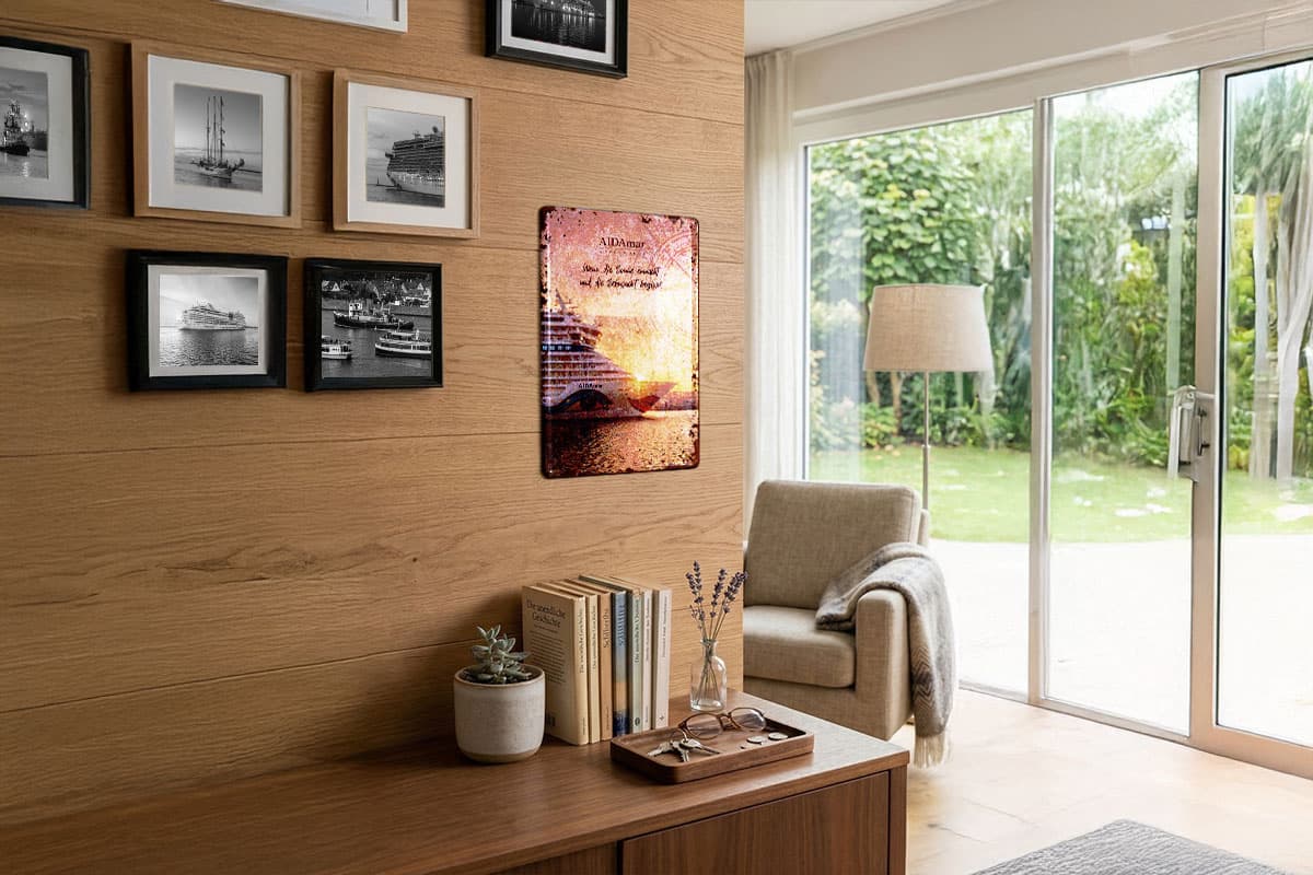 Das Motiv der AIDAmar im glühenden Morgenlicht wird durch den edlen Vintage-Look mit täuschend echten Rost- und Abnutzungseffekten perfekt abgerundet. Ob im Wohnzimmer, im Flur oder als Highlight in deiner maritimen Sammlerecke – dieses Schild versprüht Wärme, Nostalgie und die unbändige Lust auf die nächste Reise.