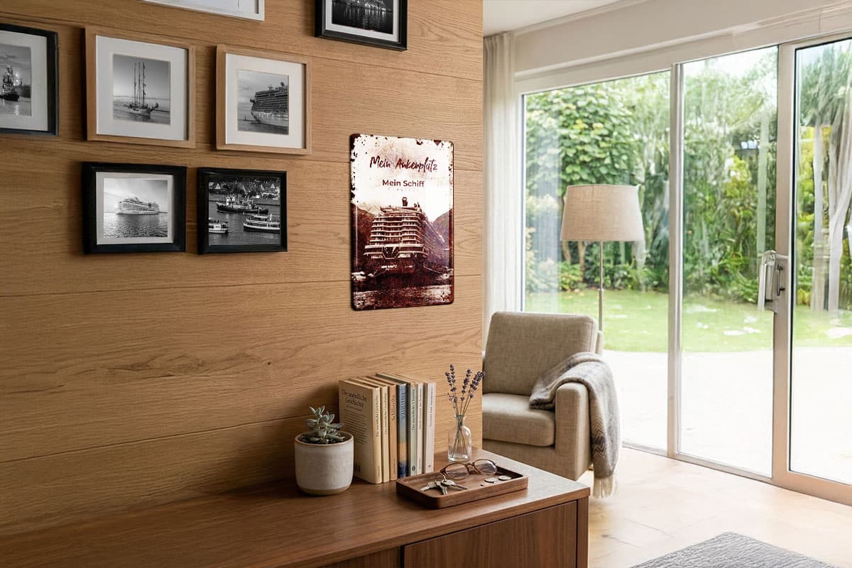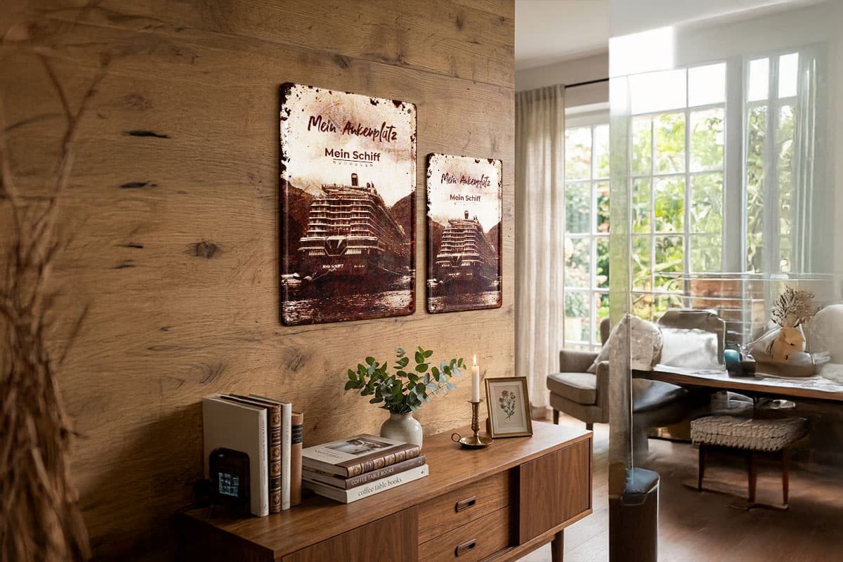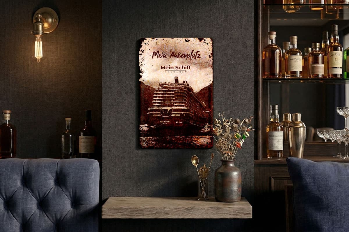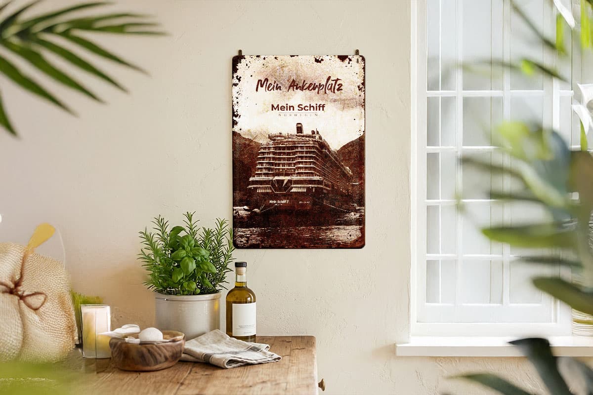 Veredelt im hochwertigen Vintage-Look, besticht das Design durch seine warme, nostalgische Farbgebung und authentische Alterungseffekte. Es ist das perfekte Geschenk für alle Fans von TUI Cruises, die ihre Liebe zu den nordischen Meeren und der Mein Schiff Flotte stilvoll zum Ausdruck bringen möchten. Auspacken und Ankern: Wir liefern das passende Befestigungsmaterial direkt mit.
