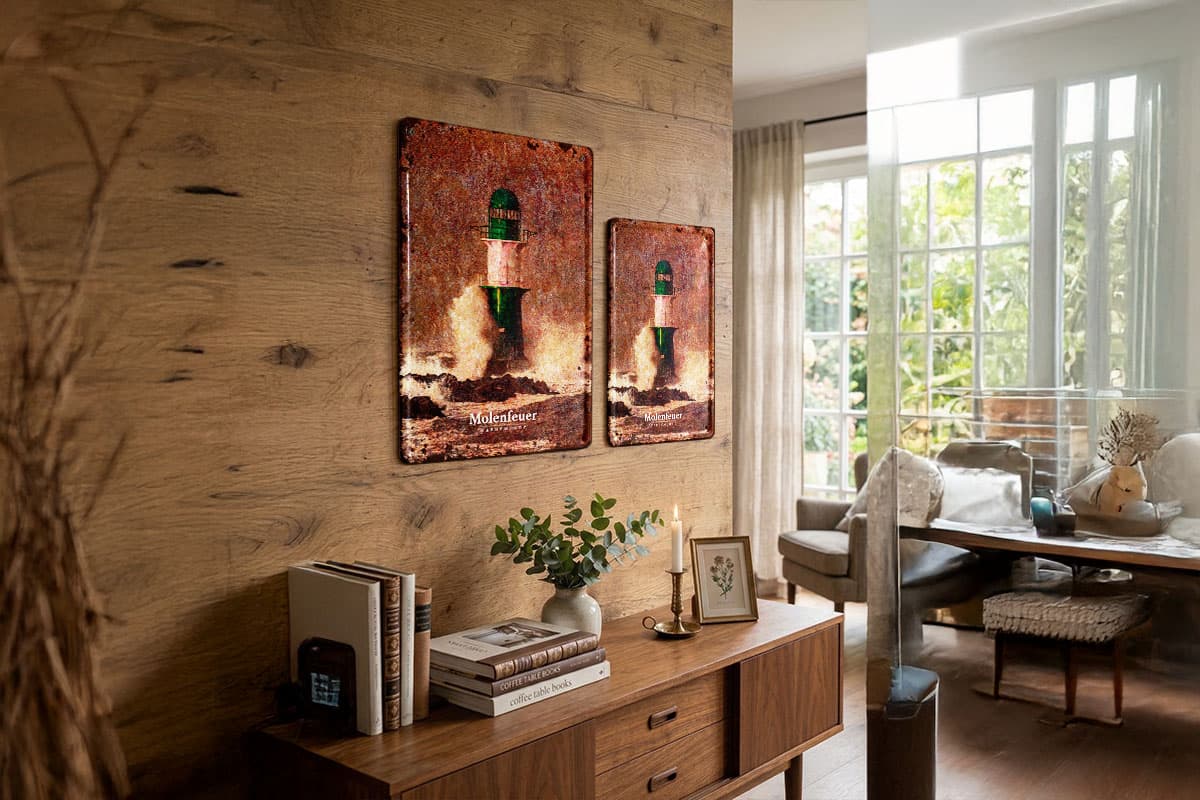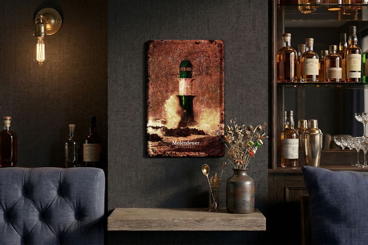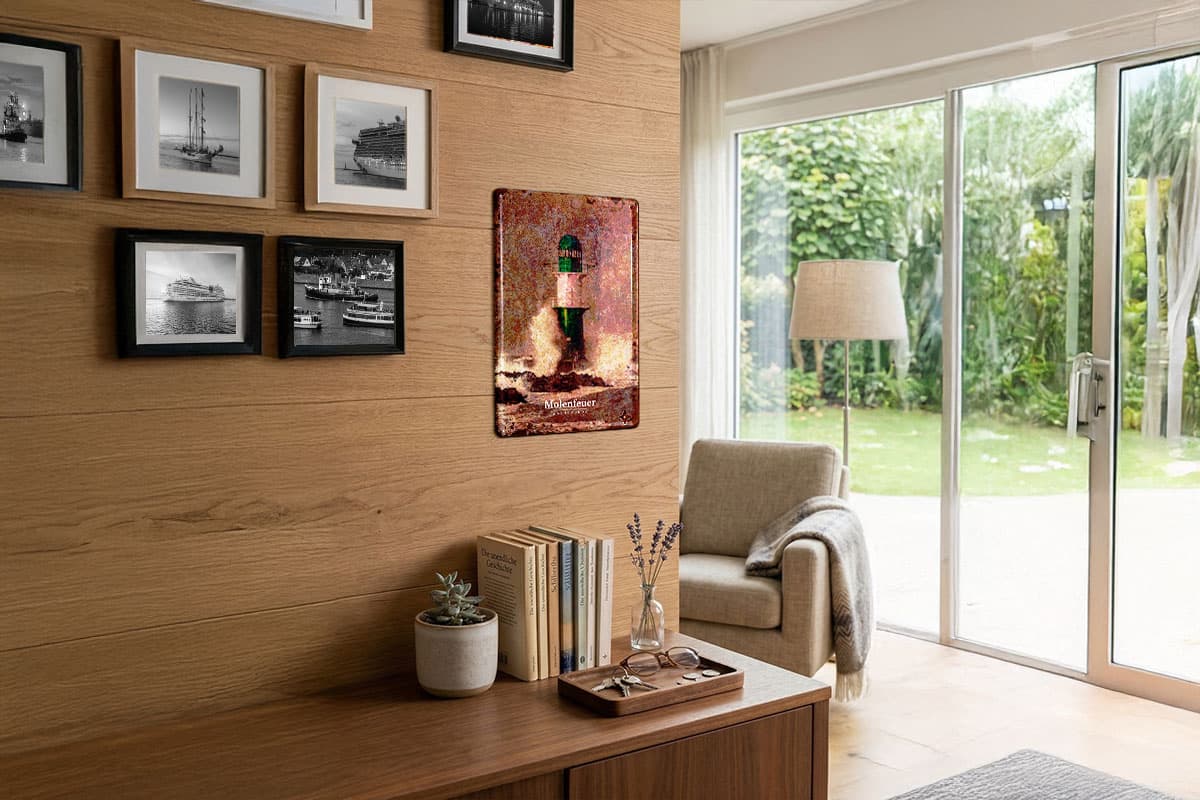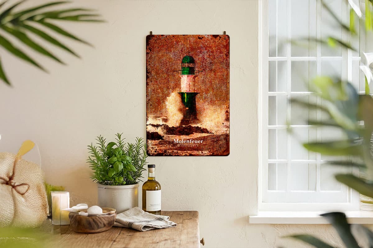 Das Schild besticht durch seine edle Vintage-Optik. Kunstvolle Patina-Effekte und dezente Rost-Akzente verleihen dem Motiv einen nostalgischen Charme, als hätte es schon Jahrzehnte dem Wind und den Wellen der Ostsee getrotzt. Ob im Wohnzimmer, im Flur oder als Highlight in deiner maritimen Ecke – dieses Schild ist ein täglicher Gruß von der Küste. Da wir möchten, dass dein Molenfeuer sicher steht, liefern wir das passende Befestigungsmaterial direkt mit.