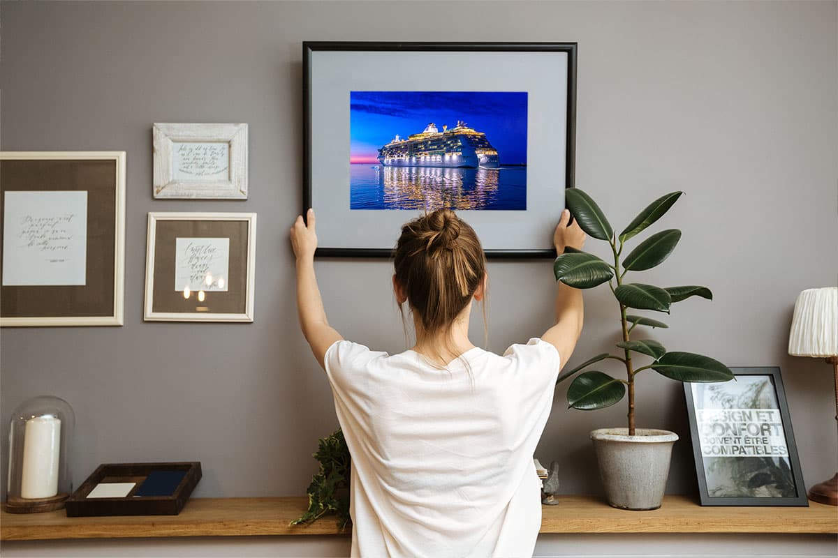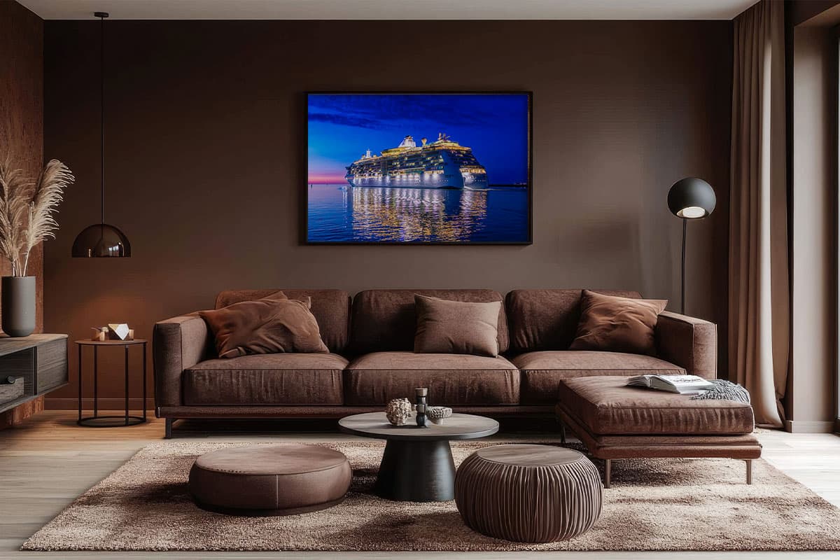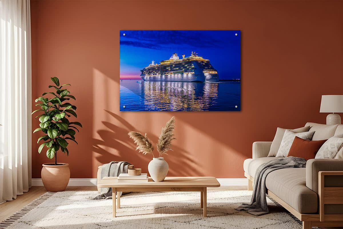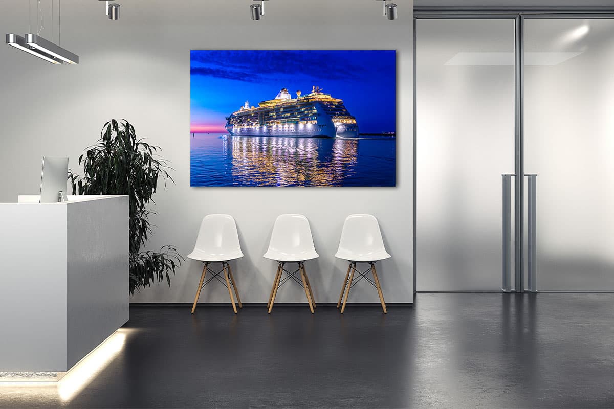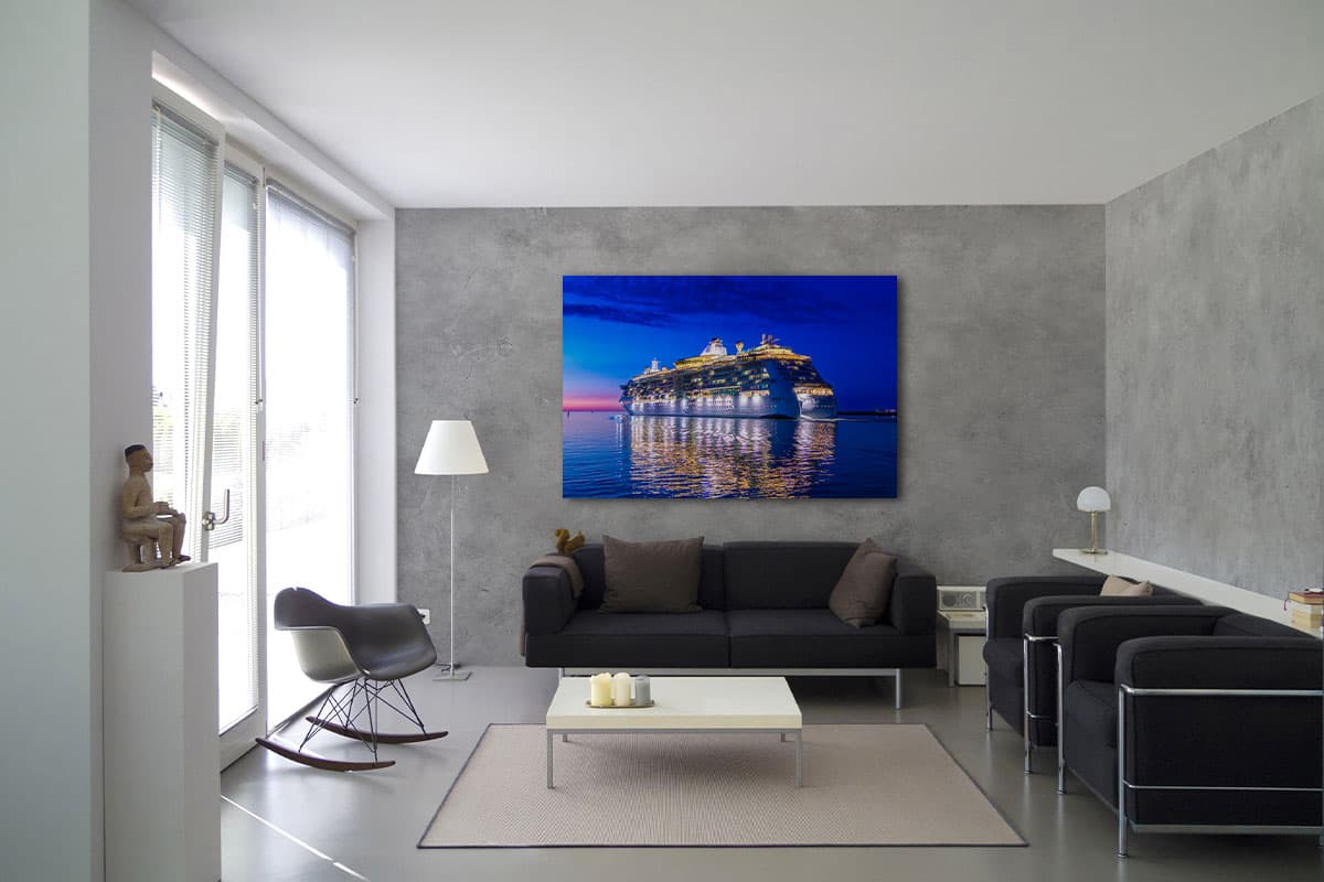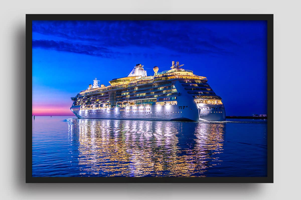 Die Besonderheit dieses Motivs ist der enorme Kontrast: Die hell erleuchteten Decks und Kabinen des Schiffes spiegeln sich in perfekter Brillanz auf der ruhigen Wasseroberfläche wider. Am linken Bildrand kündigt ein sanfter rosa Schimmer am Horizont das Ende eines perfekten Tages an der Küste an. Dieses Bild bringt die luxuriöse und zugleich beruhigende Atmosphäre einer Kreuzfahrtnacht direkt in deine vier Wände.