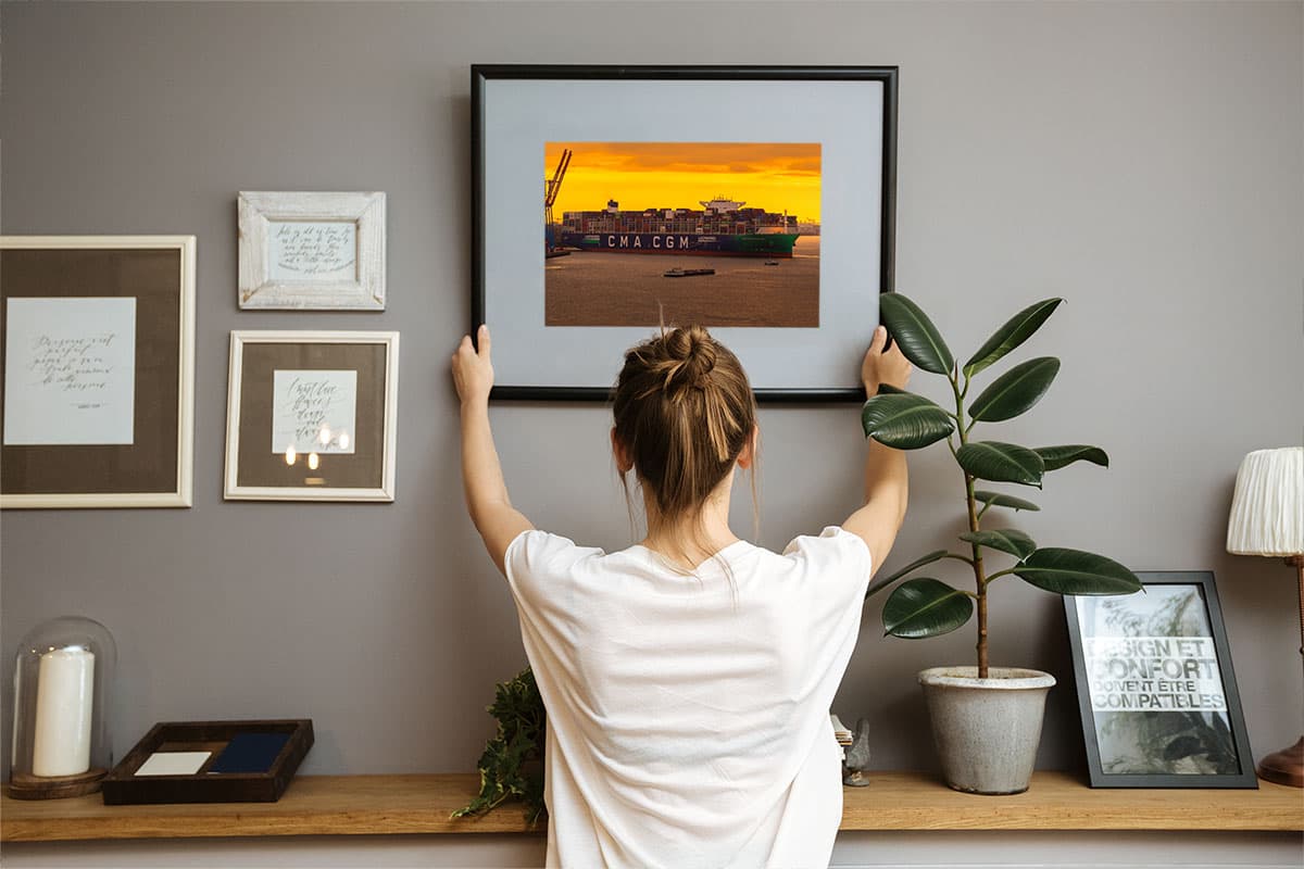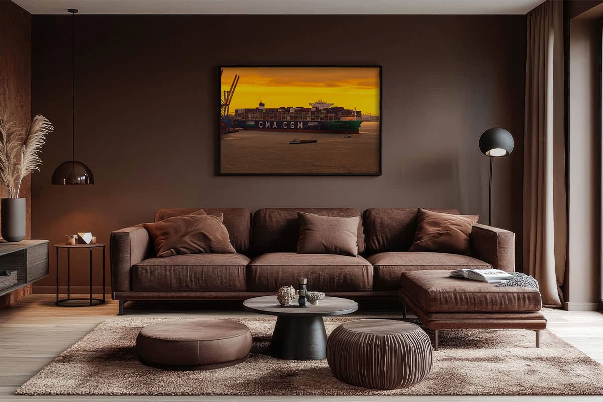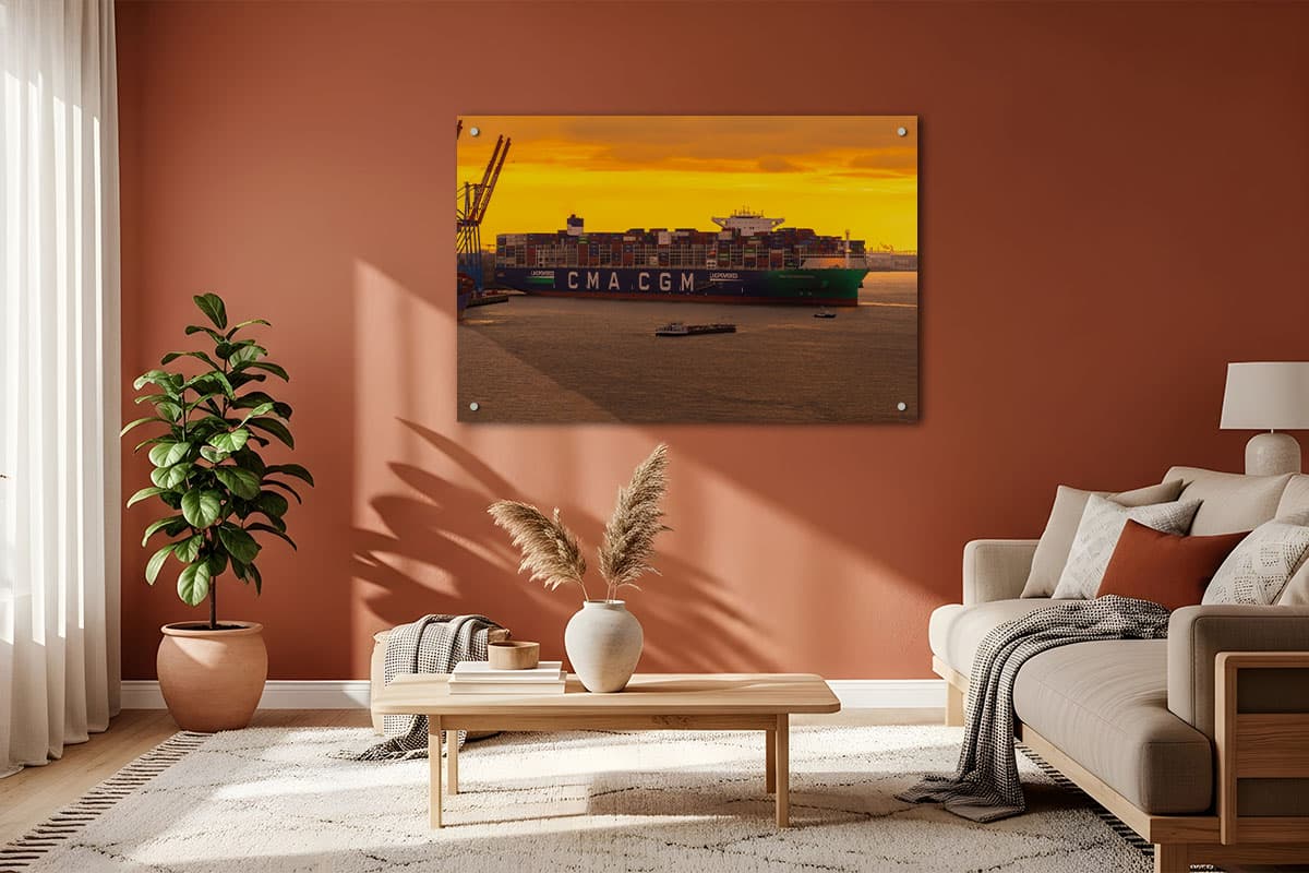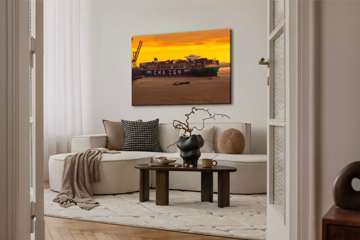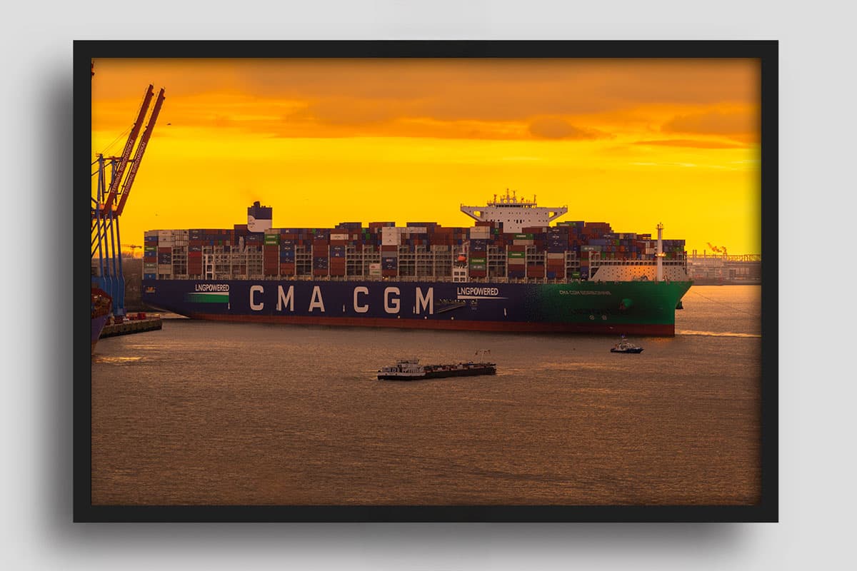 Erlebe die faszinierende Welt der globalen Schifffahrt in einem spektakulären Licht! Das Wandbild „CMA CGM – Harbor Glow“ zeigt das LNG-betriebene Containerschiff CMA CGM Sorbonne bei einem präzisen Anlegemanöver im Hamburger Hafen. Das Motiv fängt den Moment ein, in dem der riesige Rumpf und die unzähligen Containerstapel vom intensiven Orange eines norddeutschen Sonnenuntergangs angestrahlt werden.