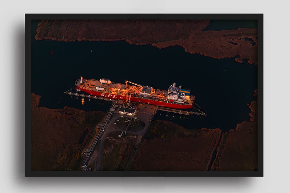 Entdecke die faszinierende Welt der globalen Logistik aus einer völlig neuen Perspektive. Das Wandbild „EPS @ YARA ROSTOCK“ zeigt einen Gastanker der renommierten Reederei Eastern Pacific Shipping (EPS) an seinem Liegeplatz im Rostocker Chemiehafen. Diese spektakuläre Luftaufnahme fängt die einzigartige Lage des Yara Terminals ein.