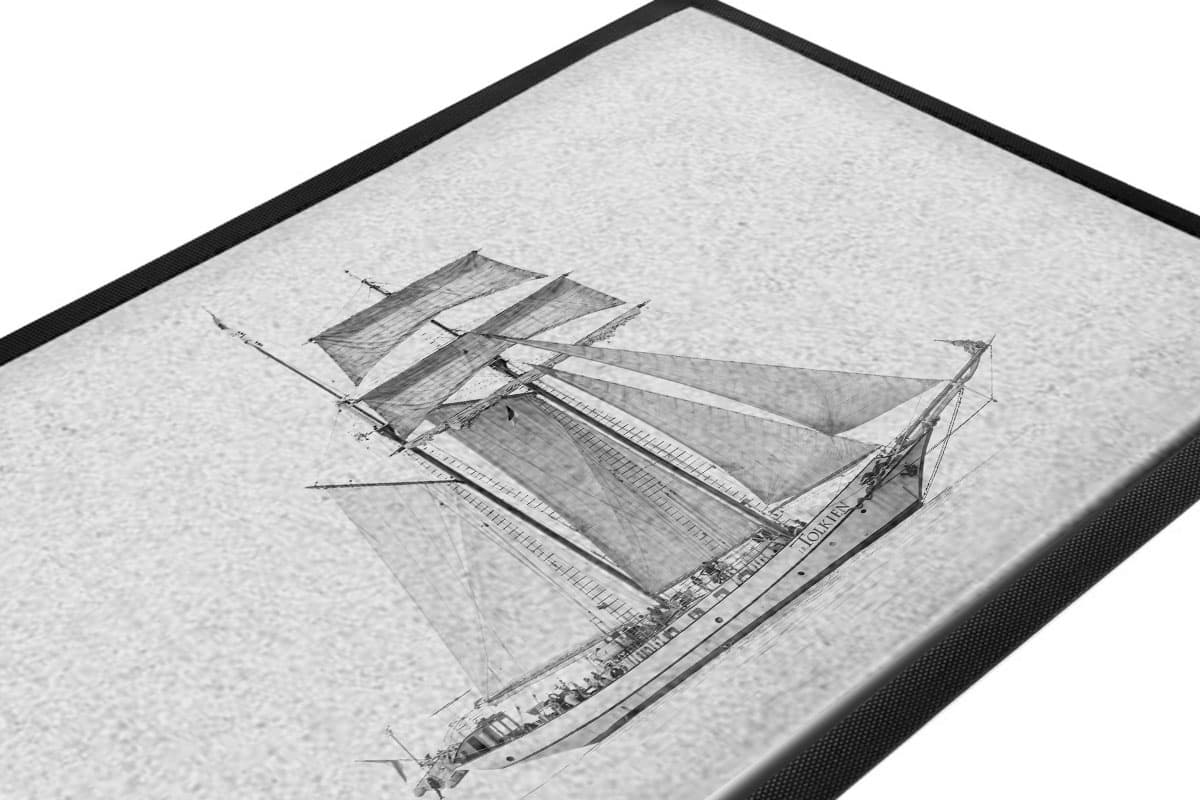 Mit der Fußmatte „J.R. Tolkien vor Warnemünde“ holst du dir echte Windjammer-Romantik nach Hause. Das Motiv zeigt den beeindruckenden niederländischen Topsegelschoner J.R. Tolkien in einer edlen, skizzierten Optik vor der Kulisse von Warnemünde. Das zeitlose Design in dezenten Graustufen passt perfekt zu jedem Einrichtungsstil und verleiht deinem Eingangsbereich eine elegante, maritime Note.