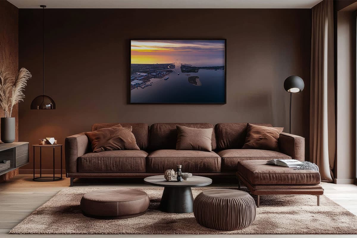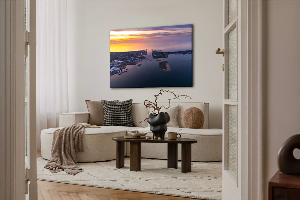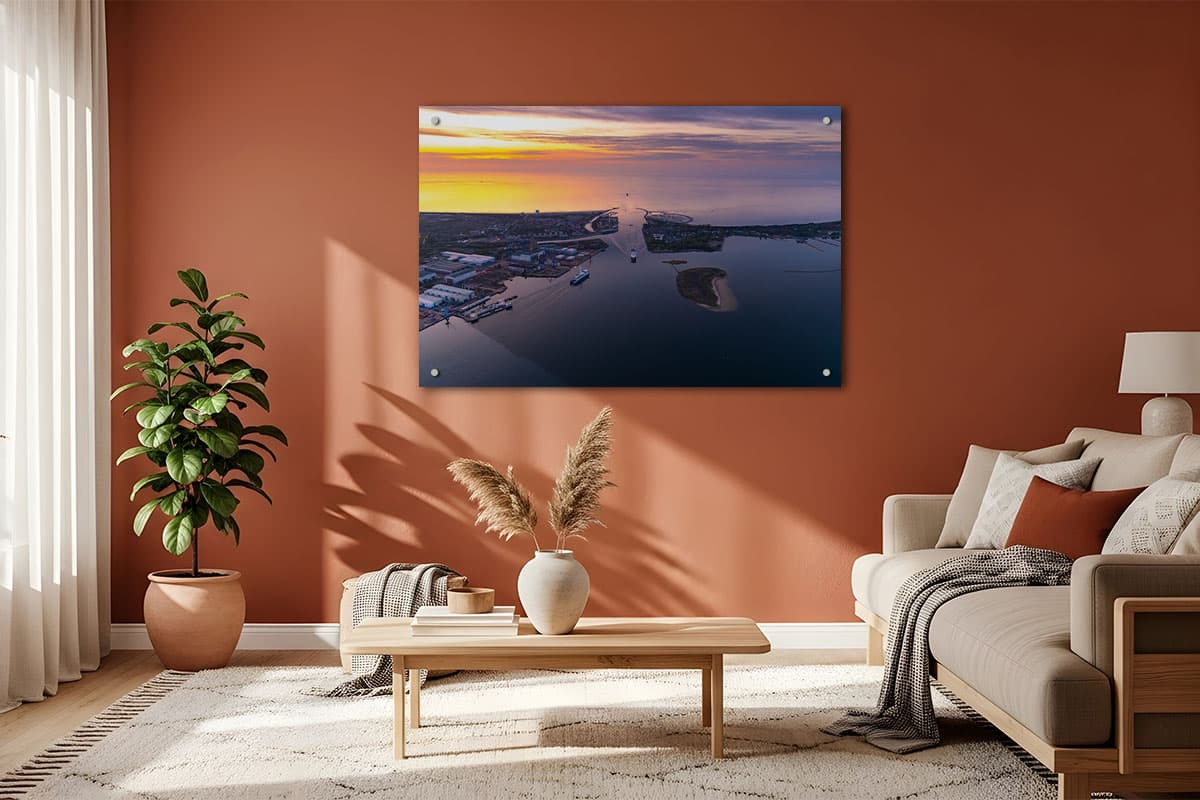 Das Wandbild „Gateway to the Baltic“ fängt einen seltenen und dynamischen Moment im Rostocker Seekanal ein: Die Begegnung der beiden markanten Fährschiffe Scandlines Berlin und Stena Line Skåne. Vor der malerischen Kulisse von Warnemünde und Hohe Düne gleiten die Schiffe majestätisch über das Wasser, während der gesamte Horizont in das warme Gold eines fantastischen Sonnenuntergangs getaucht ist.