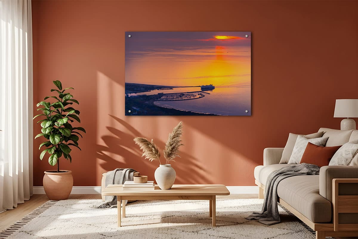 Erlebe den Moment, in dem die Ostsee in flüssigem Gold erstrahlt. Das Wandbild „Golden Gate Warnemünde“ präsentiert eine atemberaubende Luftaufnahme der Hafeneinfahrt von Warnemünde zur „Golden Hour“. Im Zentrum gleitet die stolze Fähre Skåne majestätisch durch das glitzernde Wasser, während die untergehende Sonne den gesamten Horizont in ein intensives Meer aus Orange-, Gold- und Purpurtönen verwandelt.