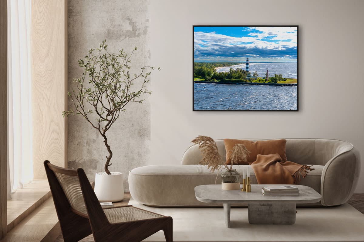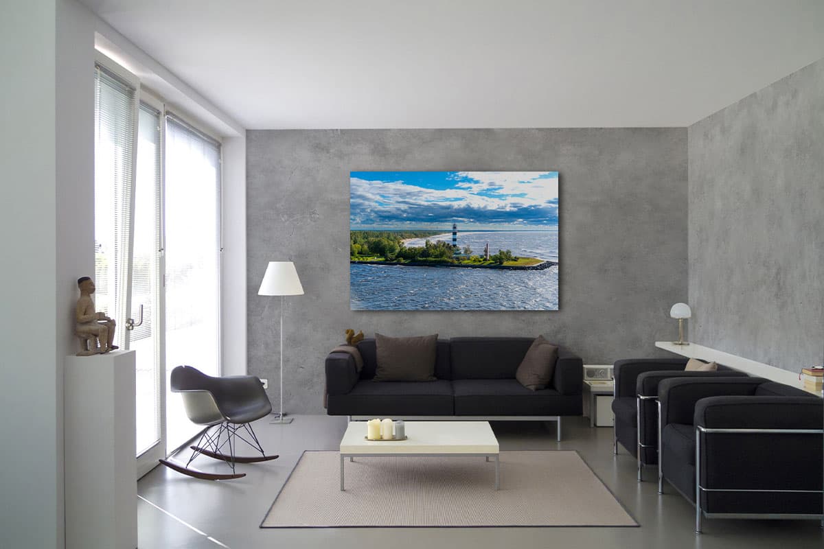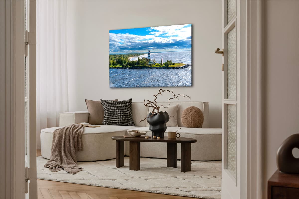 Das Wandbild „Leuchtturm Daugavgrīva“ holt dir ein Stück unberührte baltische Küstenlandschaft direkt in deine vier Wände. Das Motiv zeigt den ikonischen, schwarz-weiß geringelten Leuchtturm von Riga, der an der Mündung der Düna (Daugava) stolz den Elementen trotzt.