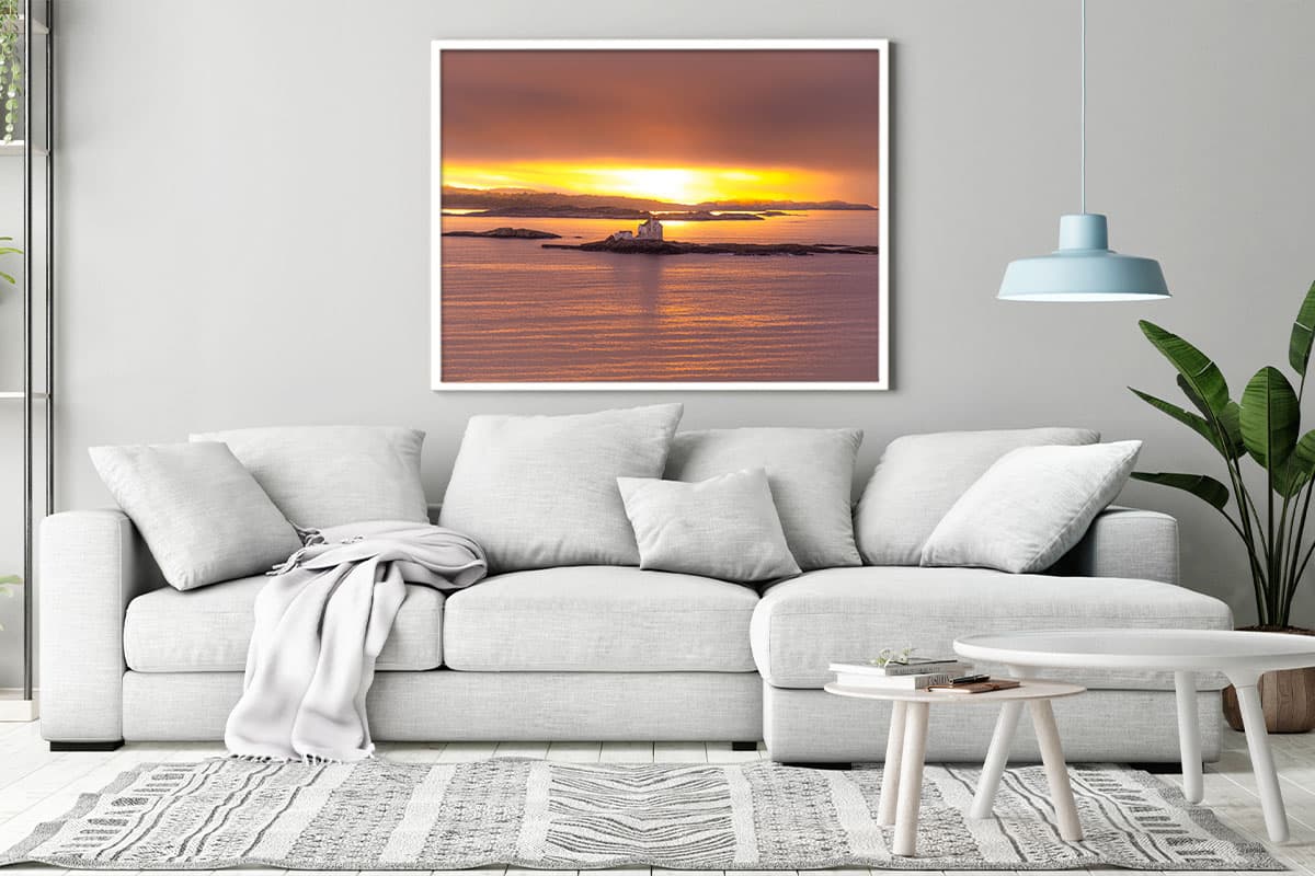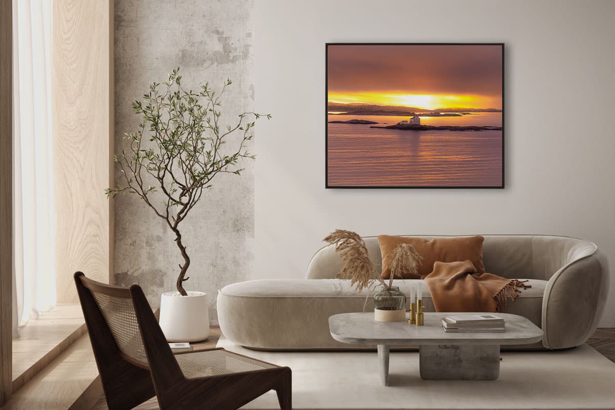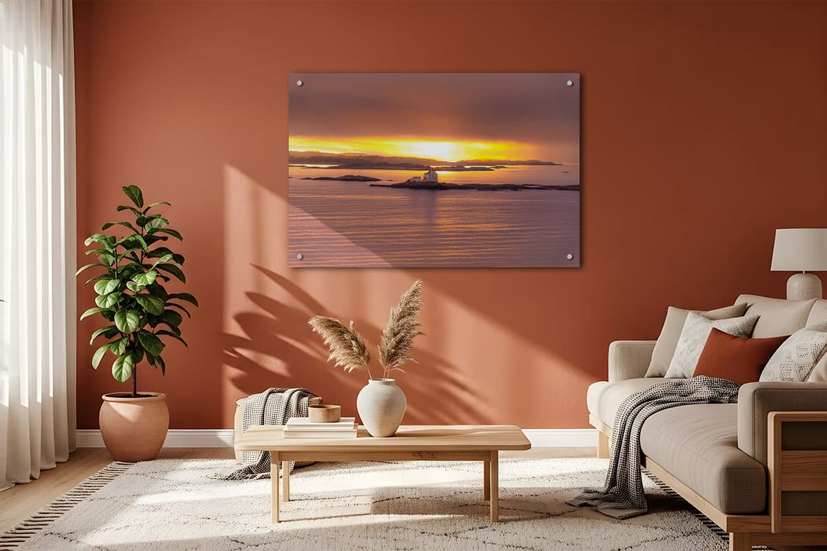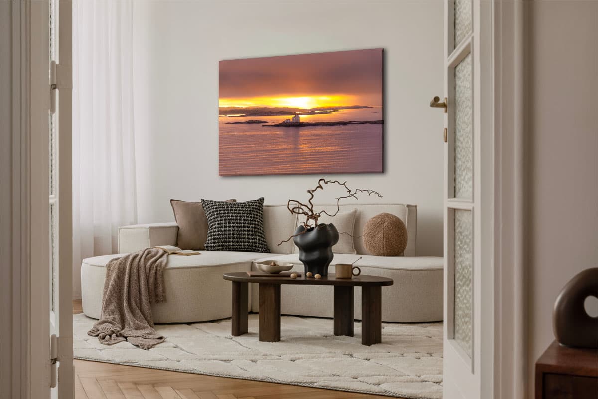 Diese Fotokunst lebt vom Kontrast: Das warme, gold-orange Licht des Himmels bricht sich in den sanften Wellen des Skagerrak, während die kargen Schärenfelsen und die Silhouette des Leuchtturms Ruhe und Beständigkeit ausstrahlen. Ein Motiv, das die raue Schönheit Skandinaviens perfekt balanciert und jedem Raum eine Atmosphäre von Weite, Frieden und nordischer Sehnsucht verleiht.