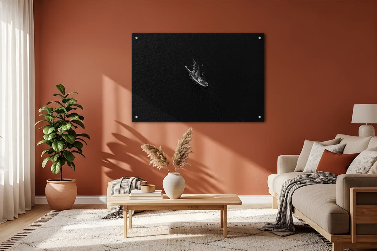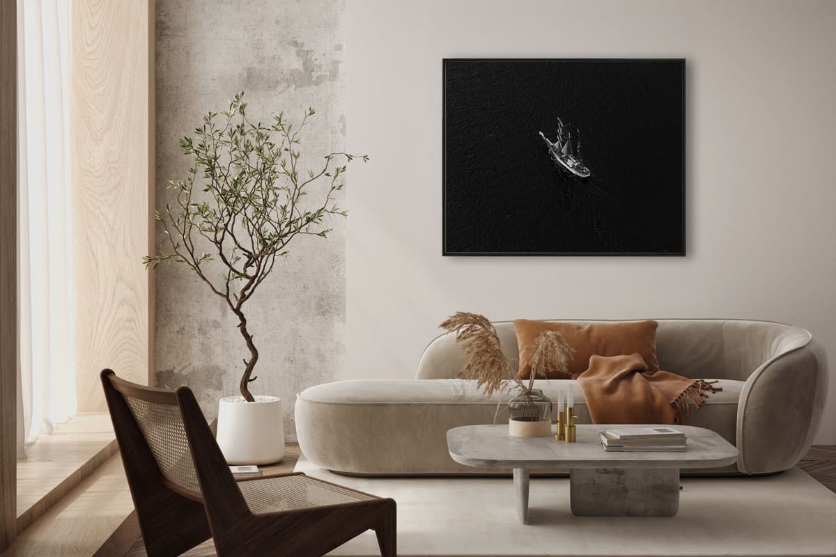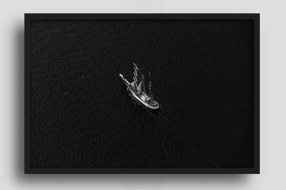 Die bewusste Entscheidung für eine tiefschwarze, kontrastreiche Schwarz-Weiß-Darstellung lenkt den Fokus weg von Farben hin zu Formen und Strukturen. Das Schiff wird zum Symbol für Beständigkeit in der Unendlichkeit des Wassers. Dieses Motiv ist das perfekte Statement-Piece für moderne Interieurs, die auf Eleganz und eine beruhigende, klare Bildsprache setzen.