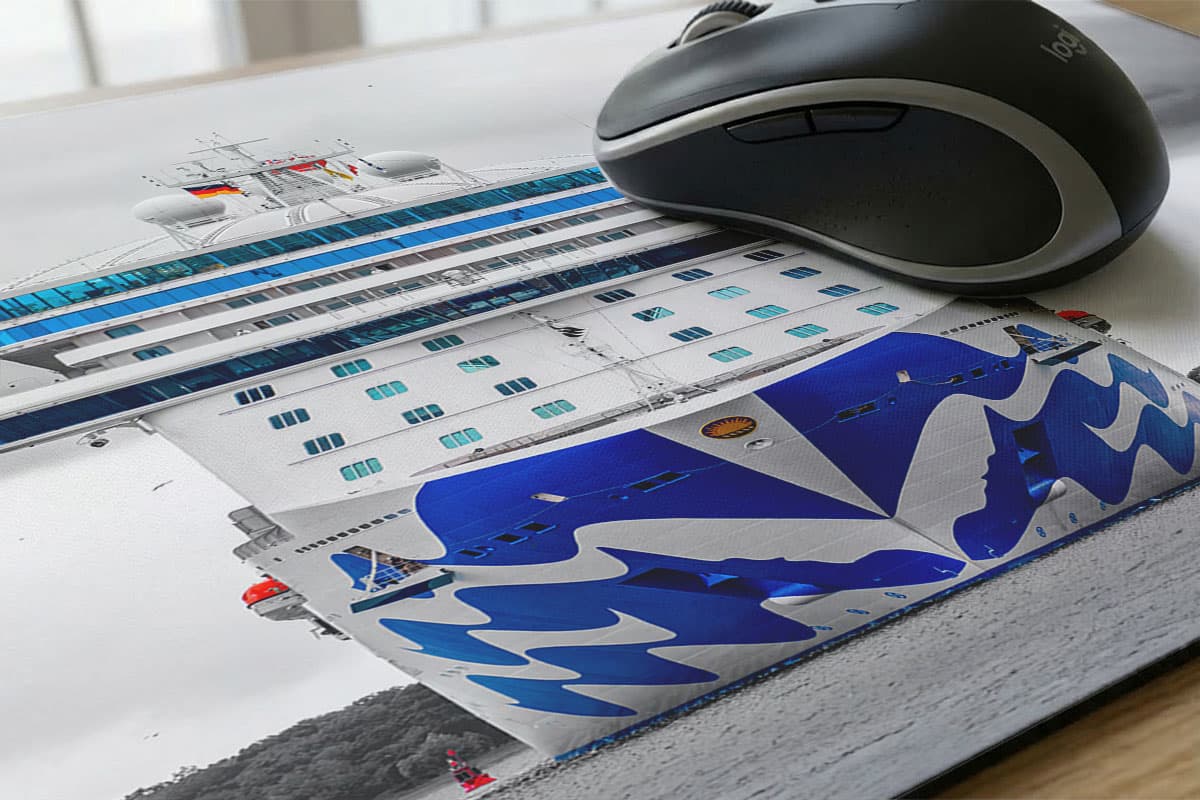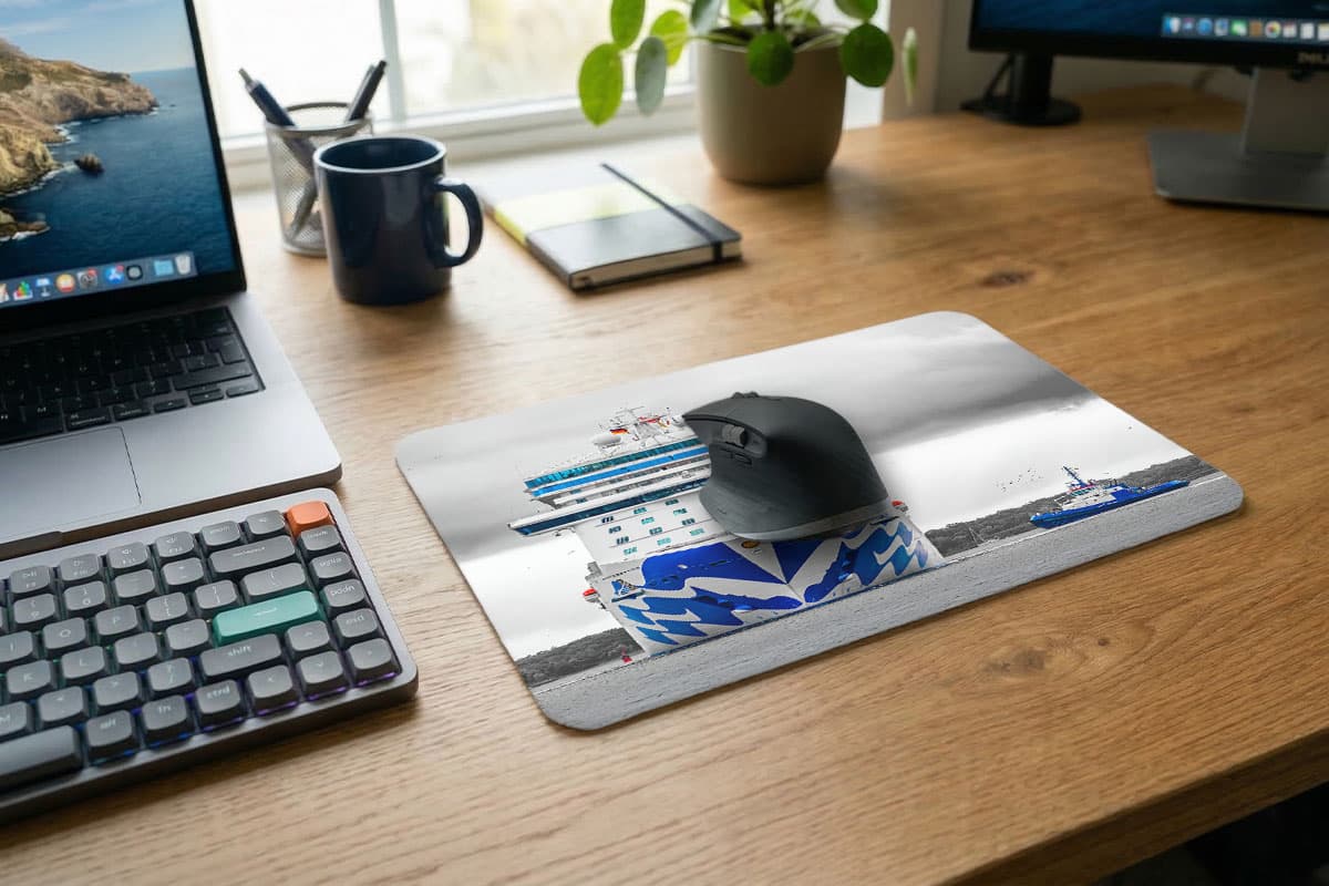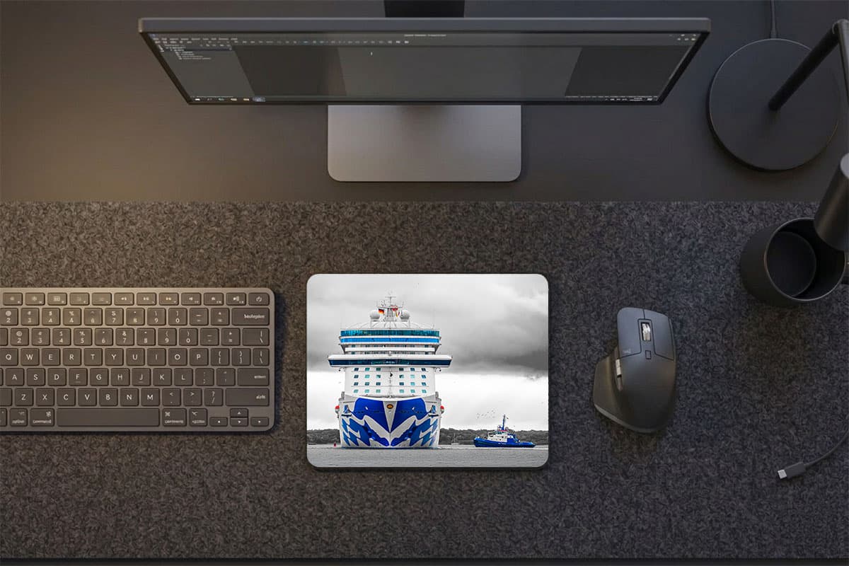 Das Mousepad „Sky Princess in Rostock“ fängt den beeindruckenden Moment ein, in dem der Ozeanriese der Princess Cruises im Rostocker Hafen manövriert. Besonders charmant: Der direkte Größenvergleich mit dem kleinen, emsigen Schlepper an der Seite – ein Motiv, das die Faszination der Schifffahrt perfekt widerspiegelt.
