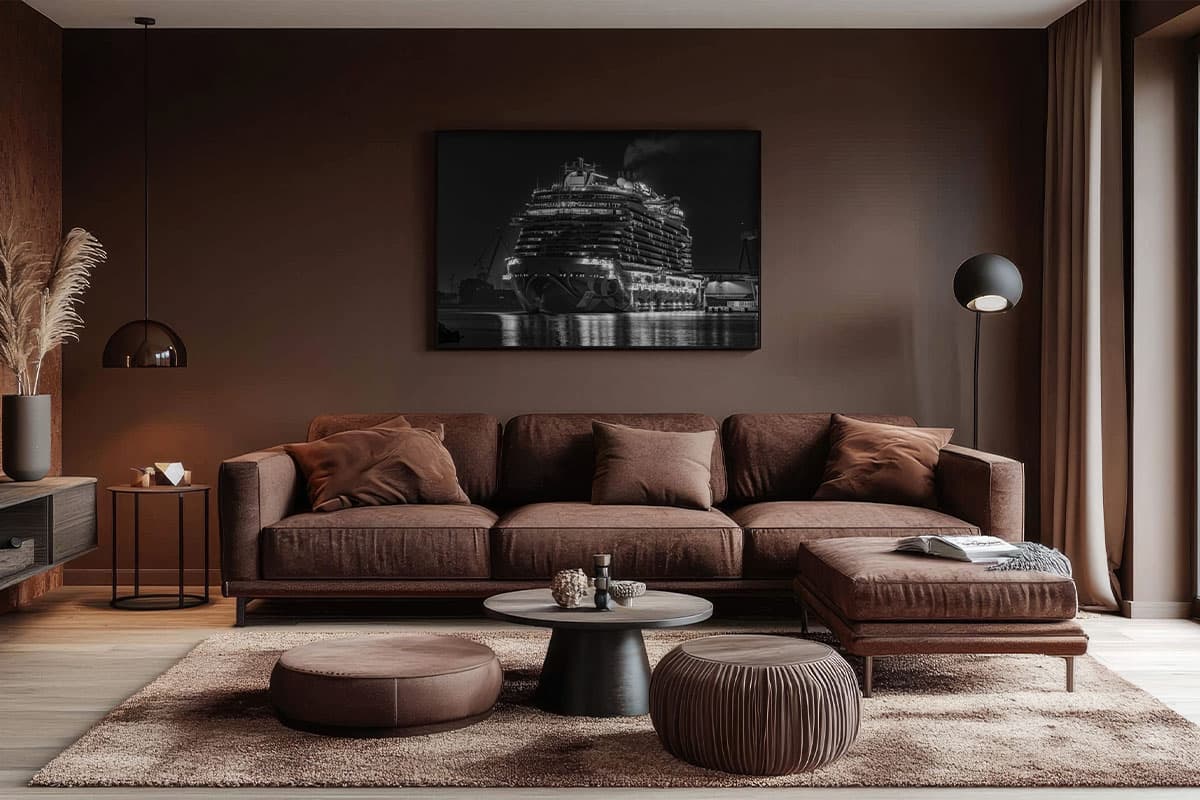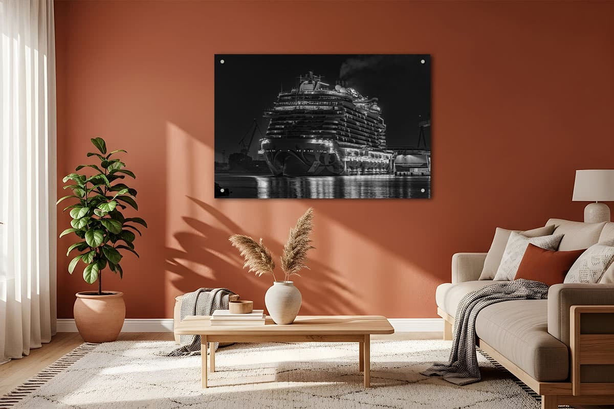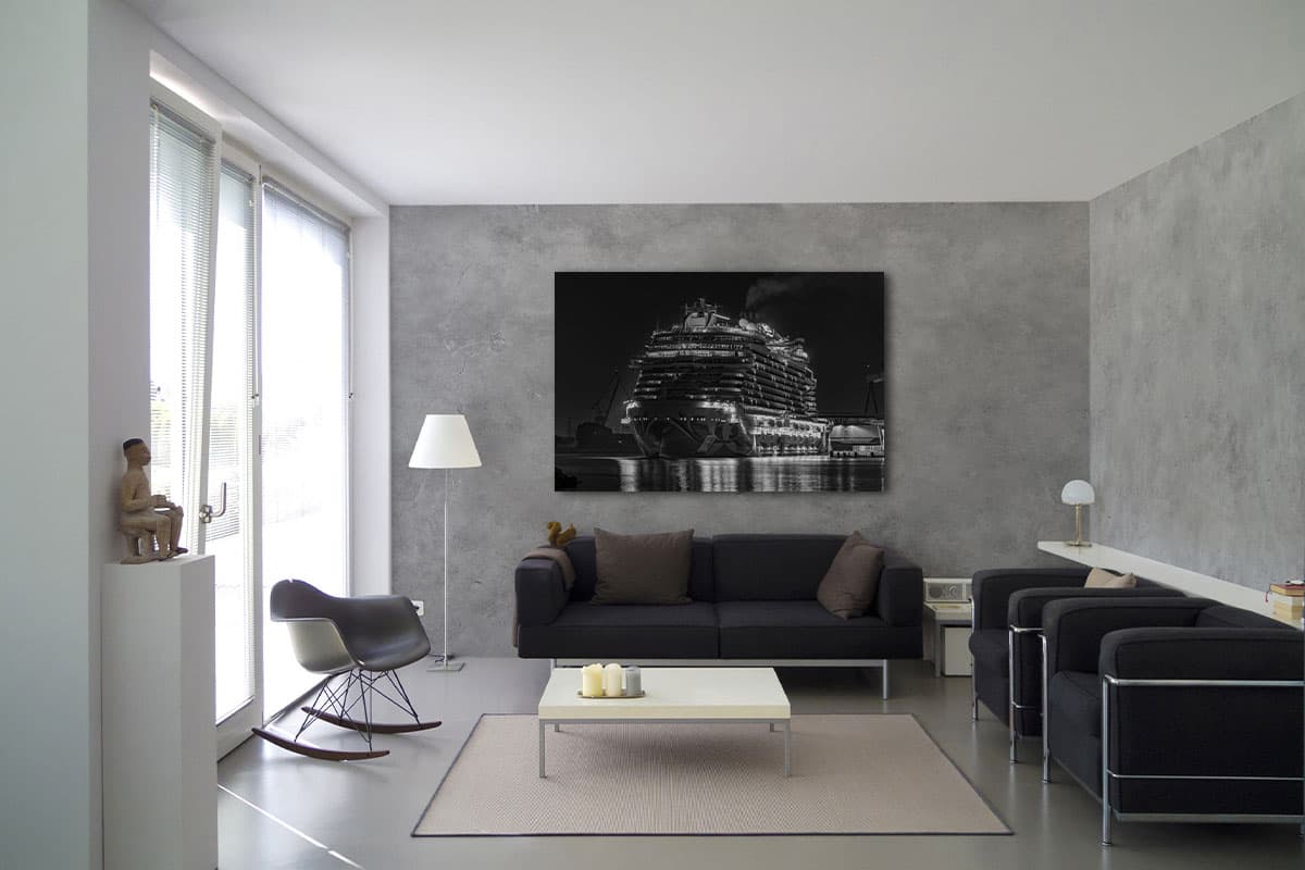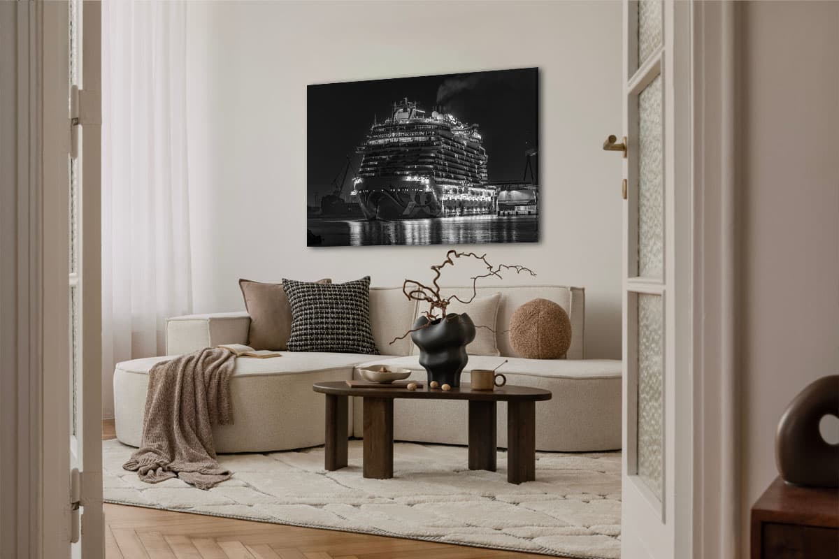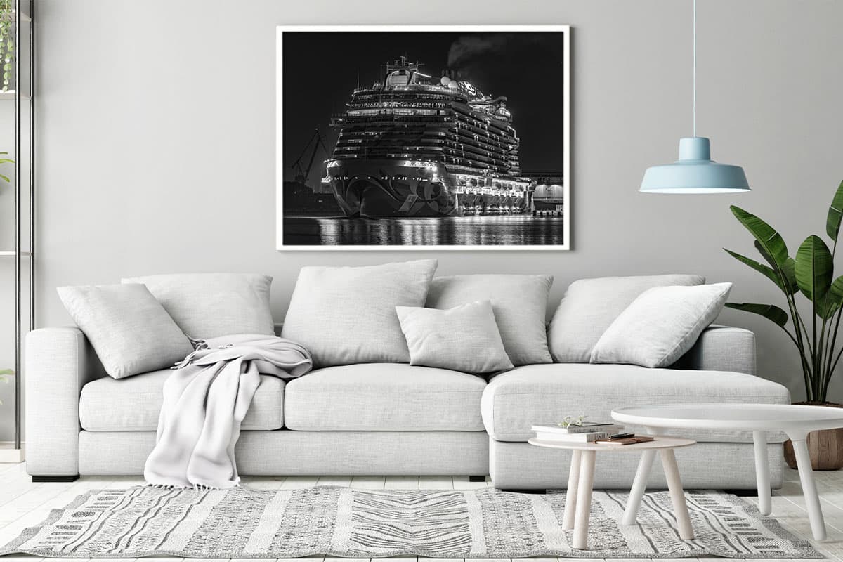 Erlebe eines der modernsten Kreuzfahrtschiffe der Welt als zeitloses Kunstwerk. Das Wandbild „Norwegian Prima @ Warnemünde“ fängt den Moment ein, in dem die Prima den Seekanal von Rostock-Warnemünde passiert. In dieser monochromen Inszenierung tritt die preisgekrönte Architektur des Schiffes besonders eindrucksvoll hervor.
