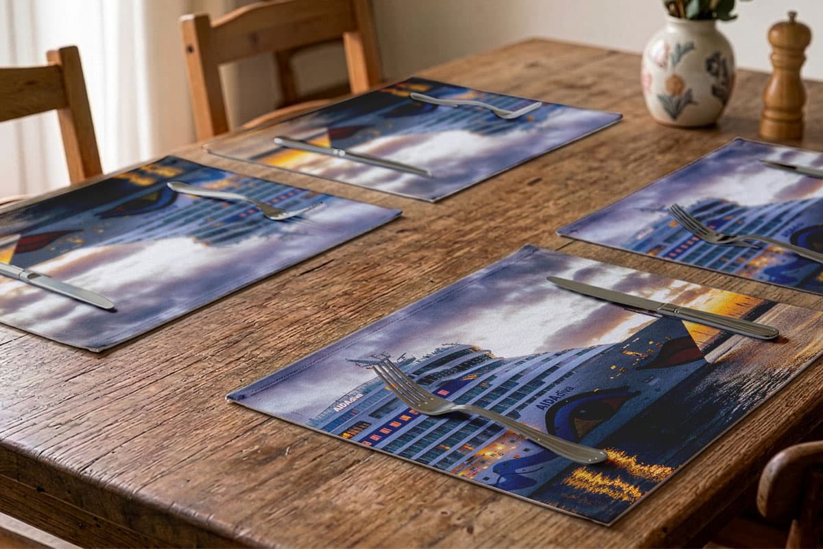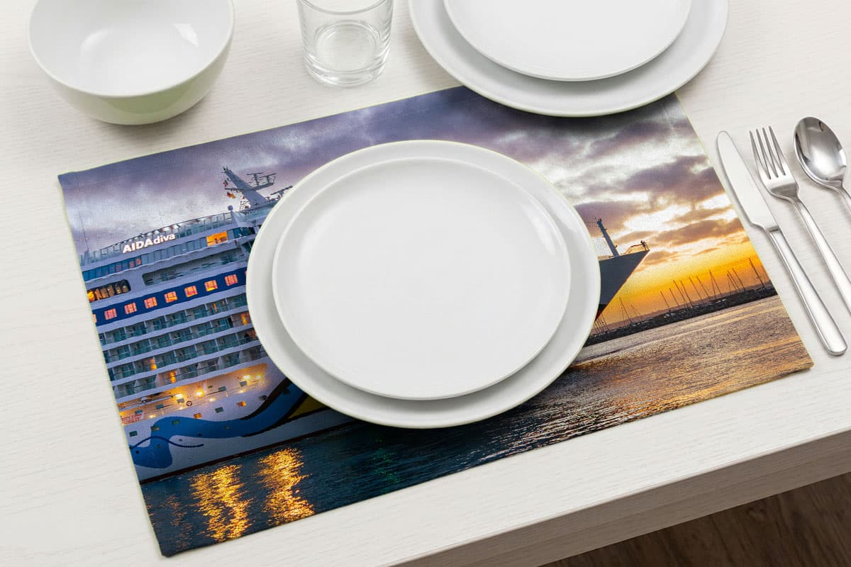 Dieses Platzset ist ein absolutes Must-have für alle AIDA-Fans und Küstenliebhaber. Die warmen Farben des Himmels und das weltbekannte Kussmund-Lächeln sorgen sofort für gute Laune und Urlaubsstimmung – ganz egal, wie grau der Morgen draußen sein mag.