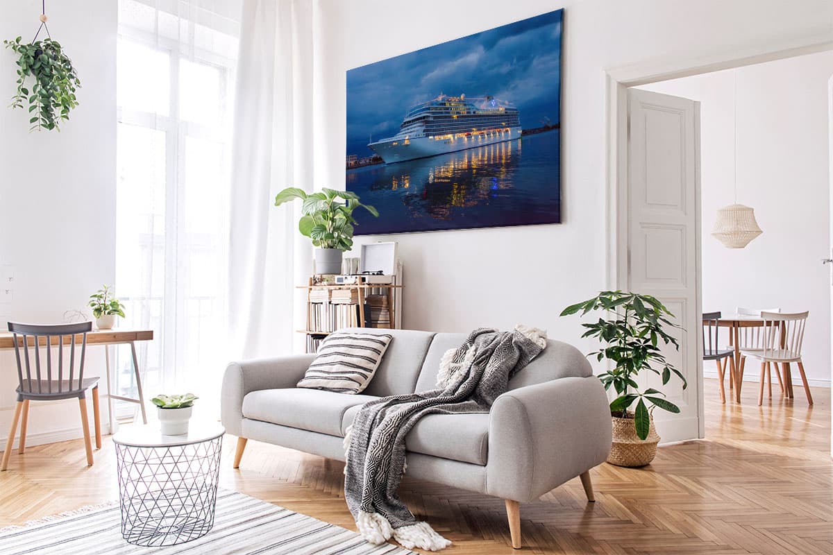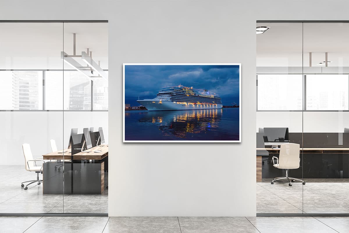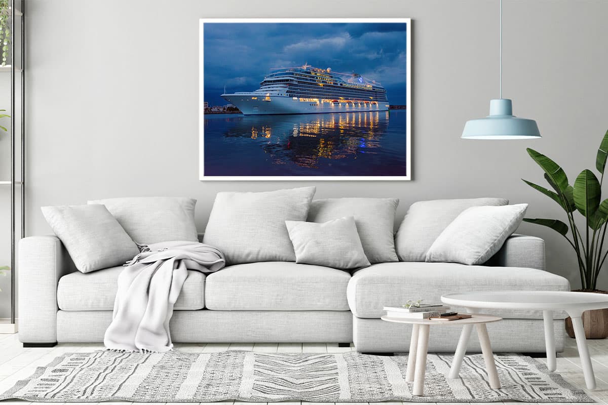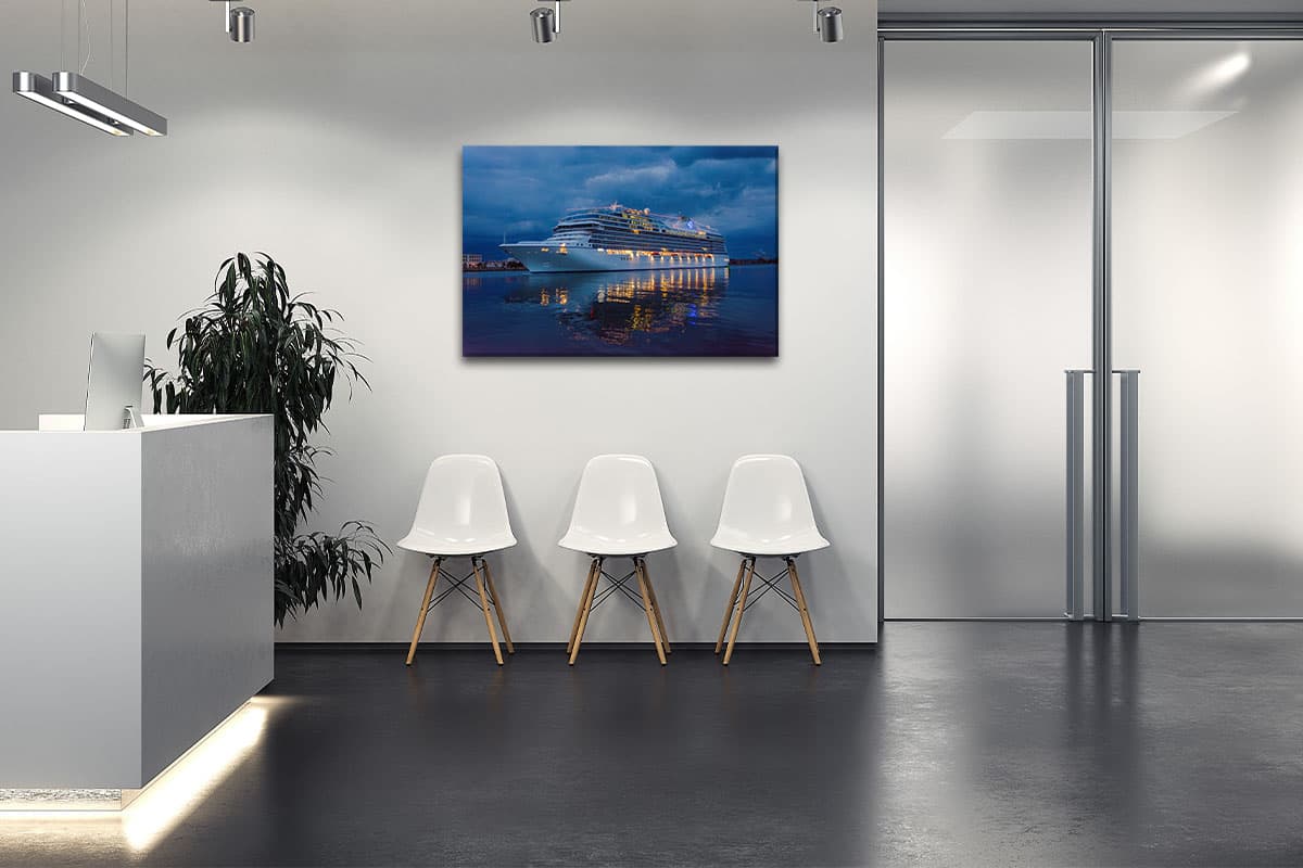 Bringen Sie den Zauber der blauen Stunde und das Fernweh einer Kreuzfahrt an Ihre Wand – ein zeitloses Kunstwerk für jeden Schiffsliebhaber.