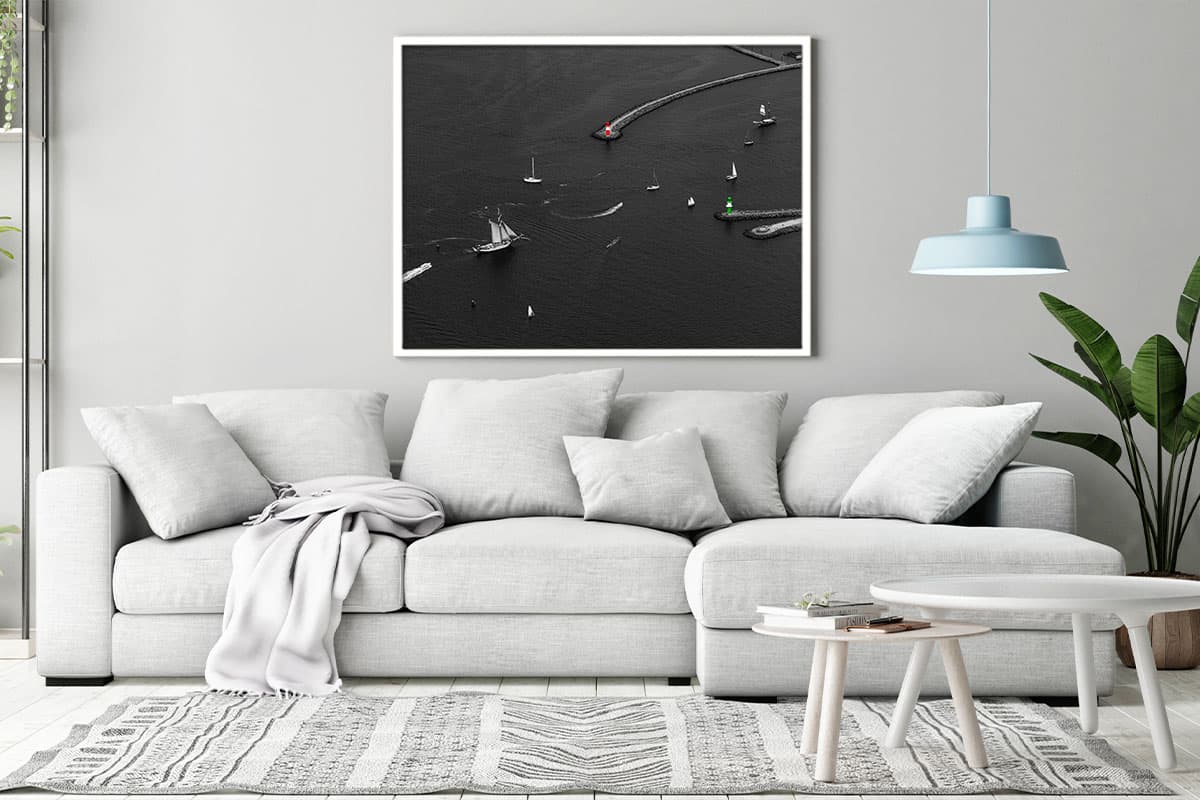 Das Besondere an diesem Werk ist die Color-Key-Bearbeitung: Während die Szenerie in zeitlosem Schwarz-Weiß gehalten ist, strahlen das rote Molenfeuer von Warnemünde und das grüne Feuer von Hohe Düne in ihren originalen Signalfarben. Diese „Wächter“ weisen nicht nur den Schiffen den Weg, sondern setzen auch einen modernen, farblichen Akzent in deinem Wohnraum.